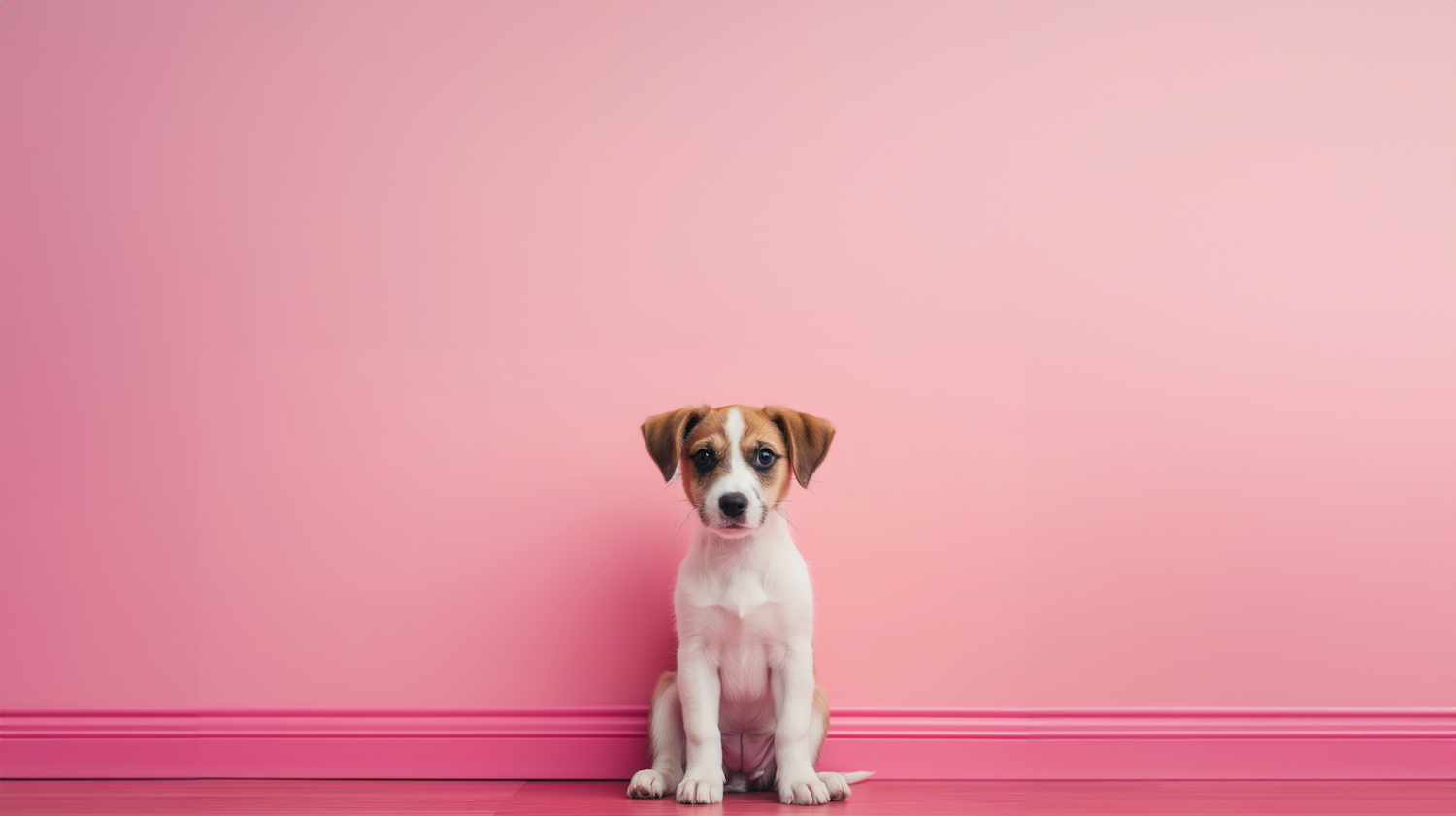 A small dog with a blurred face sits against a vibrant pink wall, creating a playful and minimalistic scene.