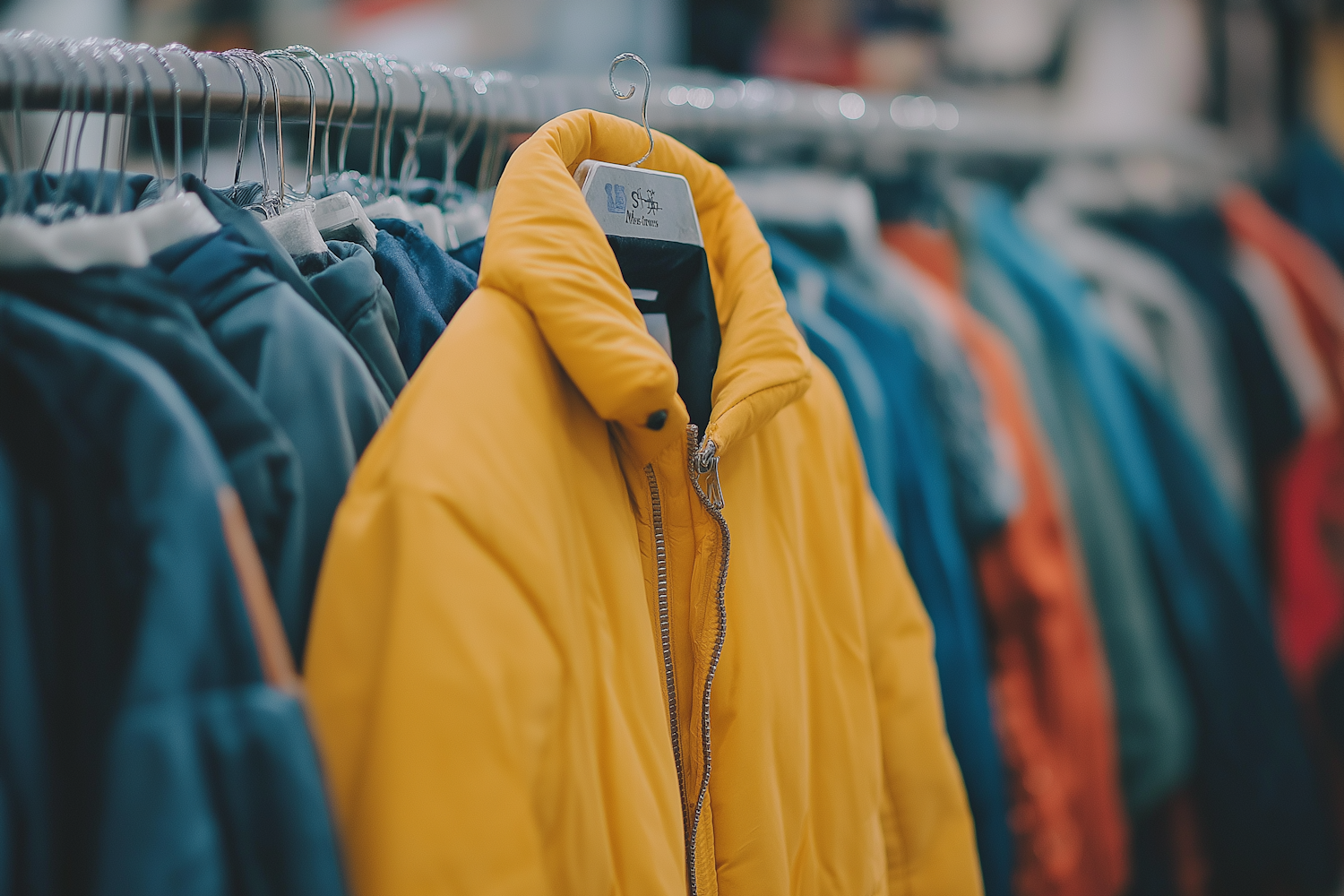 Bright yellow puffer jacket on a rack with blue and orange jackets, creating a colorful display in a clothing store.
