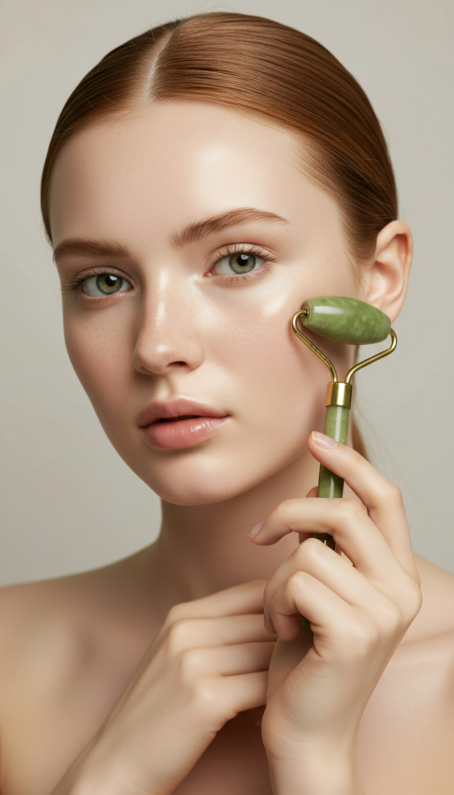 A serene portrait of a woman using a jade roller, showcasing her glowing skin and the tool's elegant design.