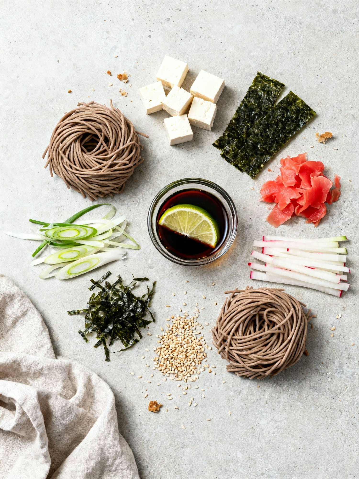Ultra-real overhead flat lay of raw ingredients: buckwheat soba nests (dry), silken tofu cubes, scallion slices, nori strips, pickled ginger, daikon matchsticks, toasted sesame seeds, and soy sauce in a glass dish with a yuzu wedge; linen napkin softly wrinkled; subtle crumbs/sesame scatter. Medium-format (150MP); 55–65 mm at f/8; big soft overhead 5600 K source through 6×6' diffusion, perimeter flags for gentle falloff; ISO 100. Angle: true 90° top-down. Surface: pale concrete. Color: clean neutrals with soft greens/reds. Negative: perfect grid symmetry, fake droplets, excessive contrast, color cast, logos, watermarks.