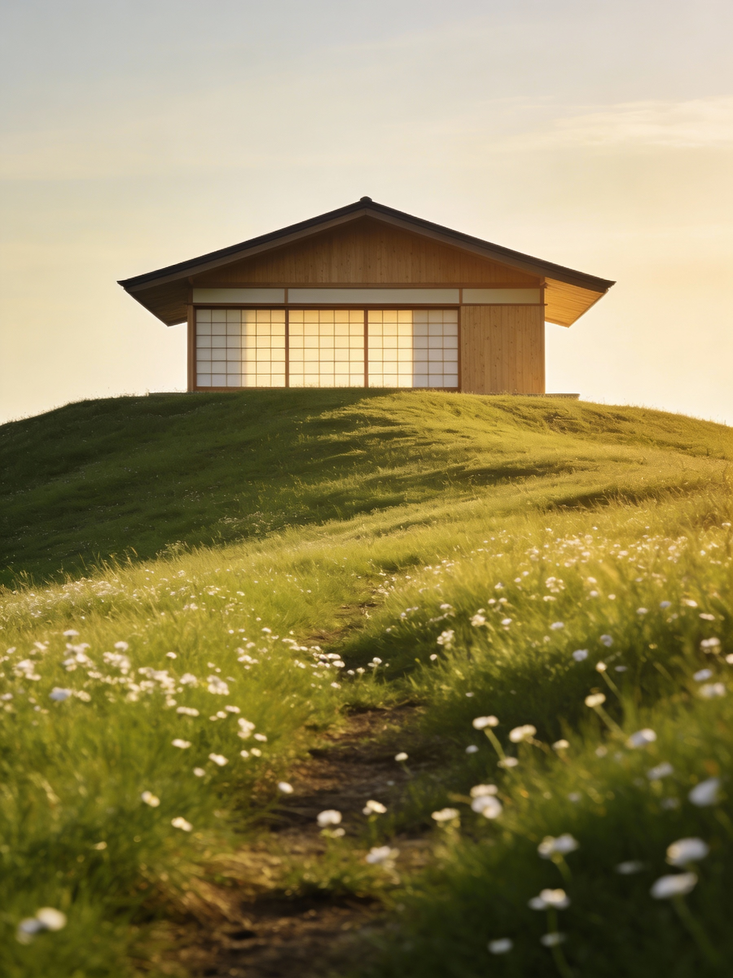 A minimalist Japanese-inspired house standing alone on top of a gentle green hill, viewed from a distance; simple low gable roof, natural timber facade, deep eaves, minimal shoji-like window panels (no patterns). Soft realistic grass and tiny white flowers, natural warm light, clear sky, subtle atmospheric depth. Serene balanced composition emphasizing simplicity and scale. No road, no fence, no trees. Ultra detailed, cinematic lighting, 8k, realistic textures, minimal design aesthetic.