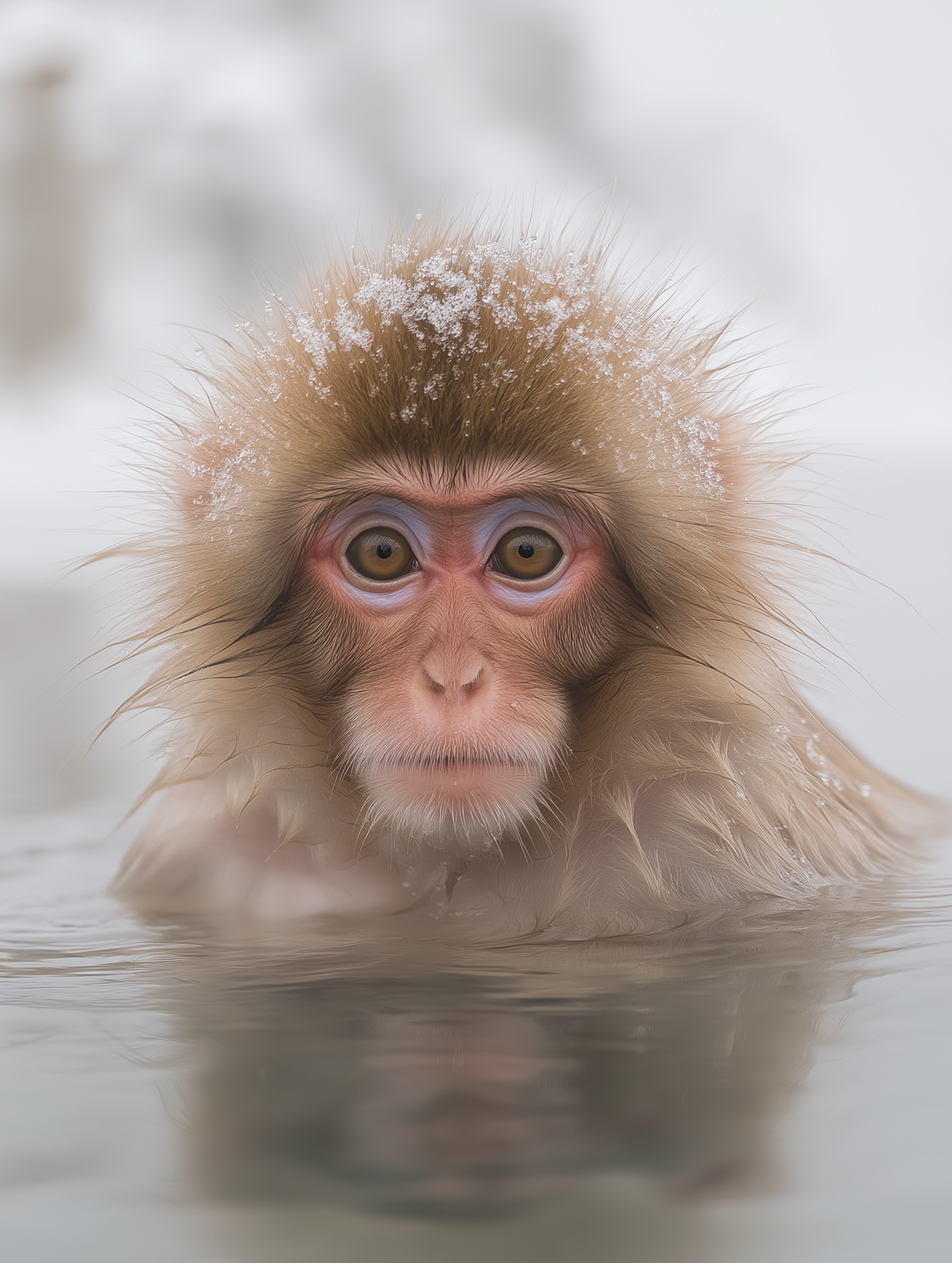 A Japanese macaque with snow on its fur relaxes in a hot spring, showcasing its expressive eyes and serene surroundings.
