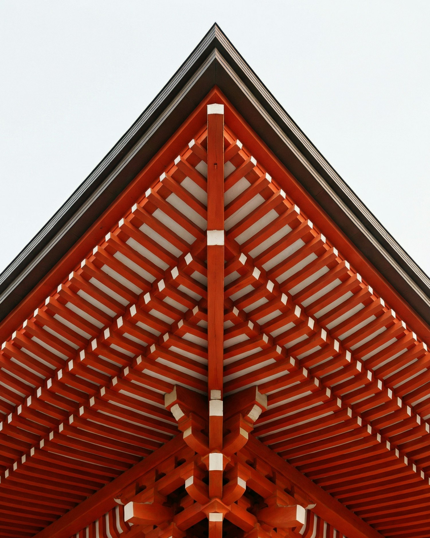 Symmetrical view of a traditional Japanese temple roof with intricate red and white wooden beams against a pale sky.