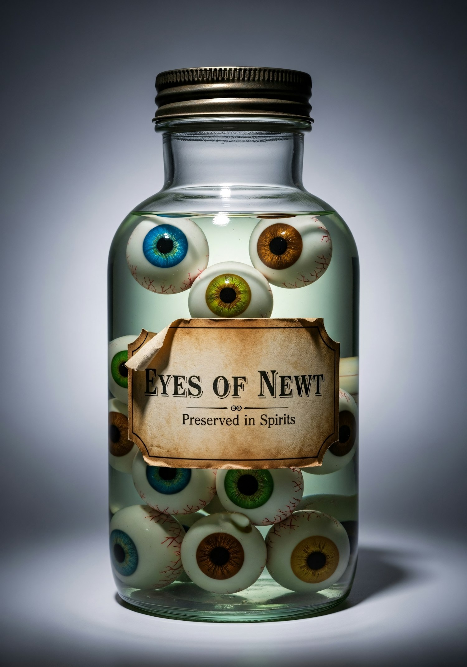 A jar labeled 'Eyes of Newt' contains colorful artificial eyeballs in liquid, creating a spooky and mystical aesthetic.