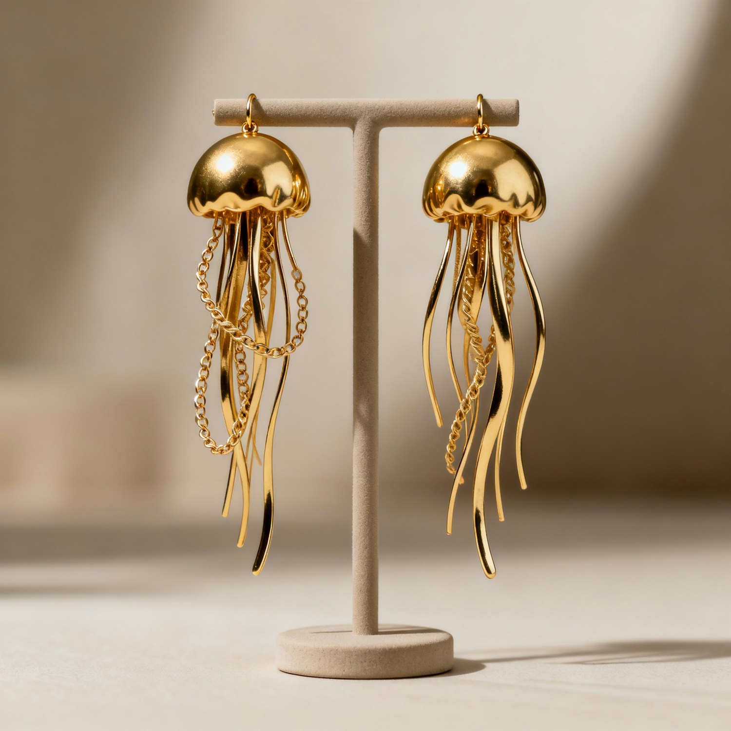 Elegant gold jellyfish-inspired earrings with intricate chain details, displayed on a neutral stand in soft lighting.