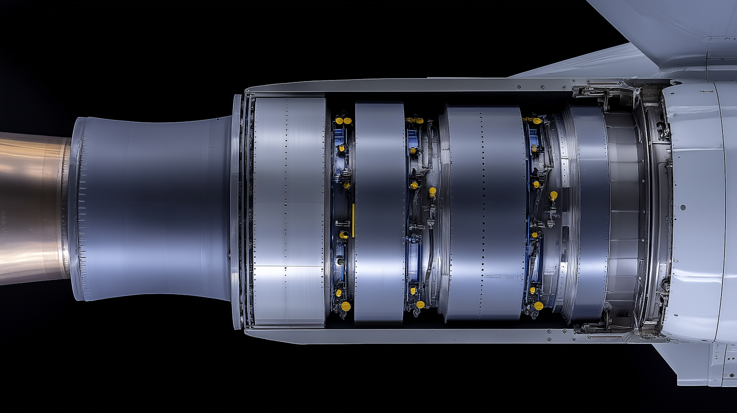Close-up of a jet engine's internal components, highlighting polished metallic surfaces and intricate engineering details.