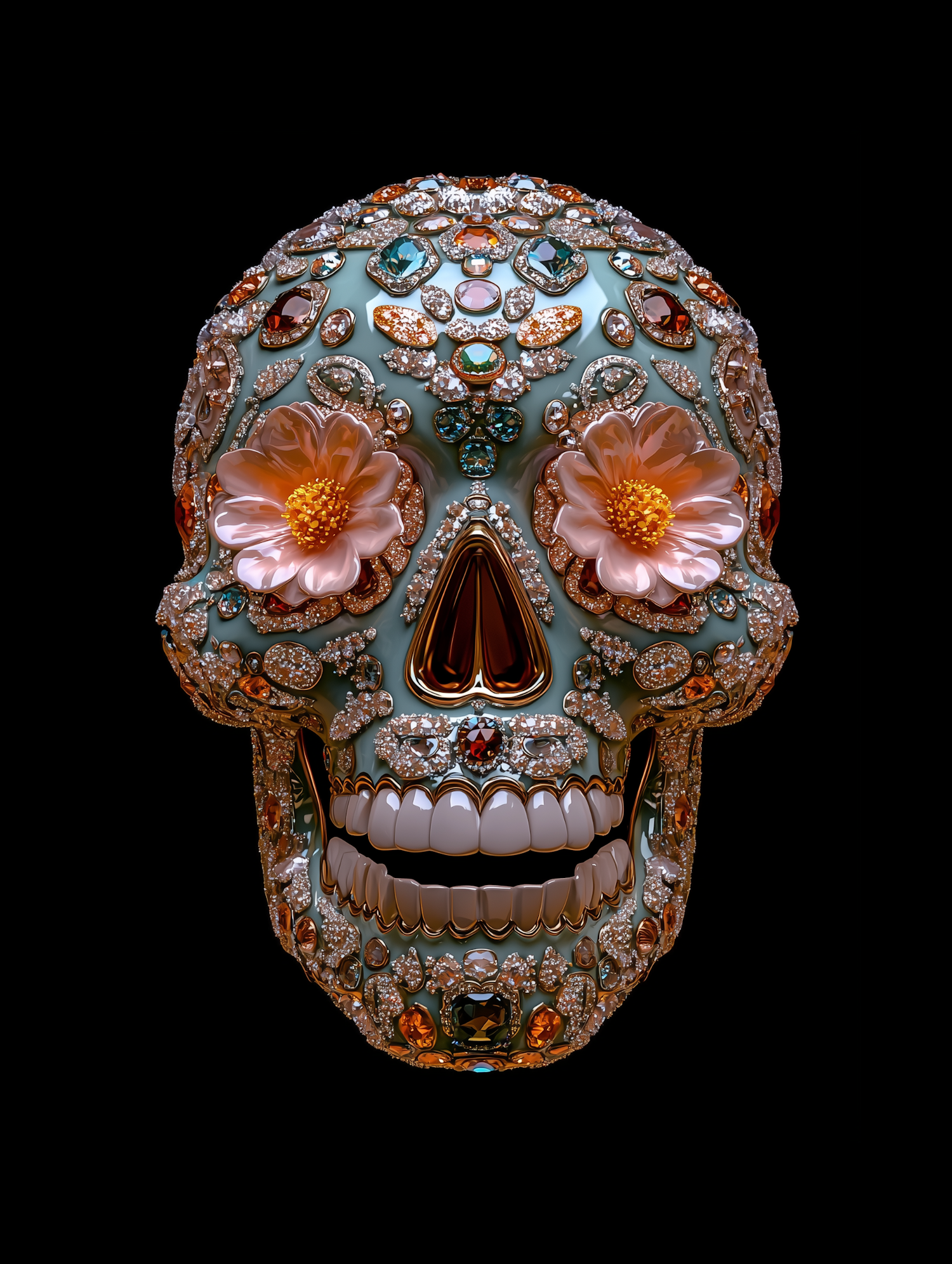 Ornate jeweled skull with colorful gemstones and flowers, blending luxury and symbolism against a dark background.