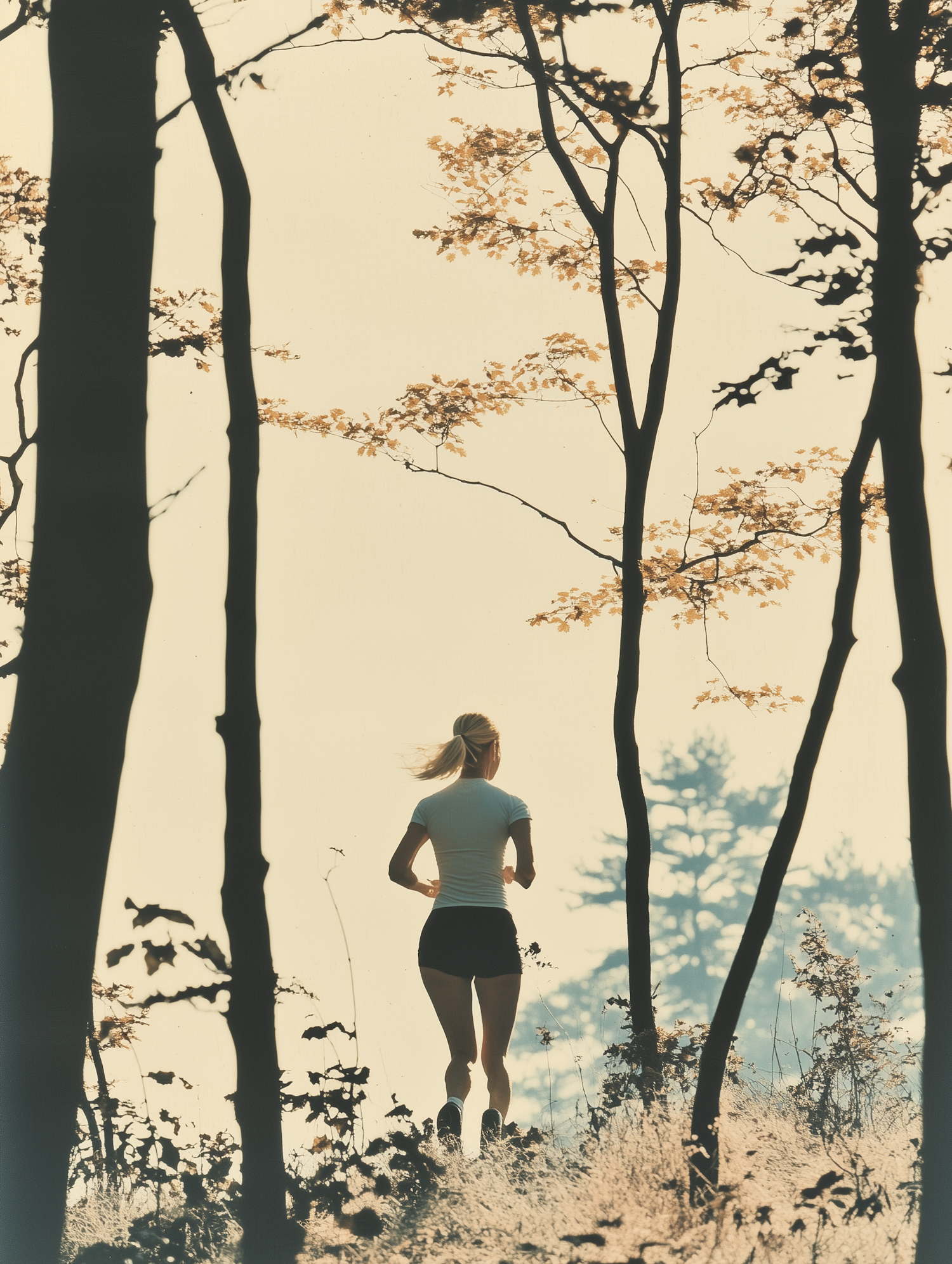 A woman jogs through a sunlit forest, surrounded by tall trees and golden autumn hues, creating a serene and tranquil atmosphere.