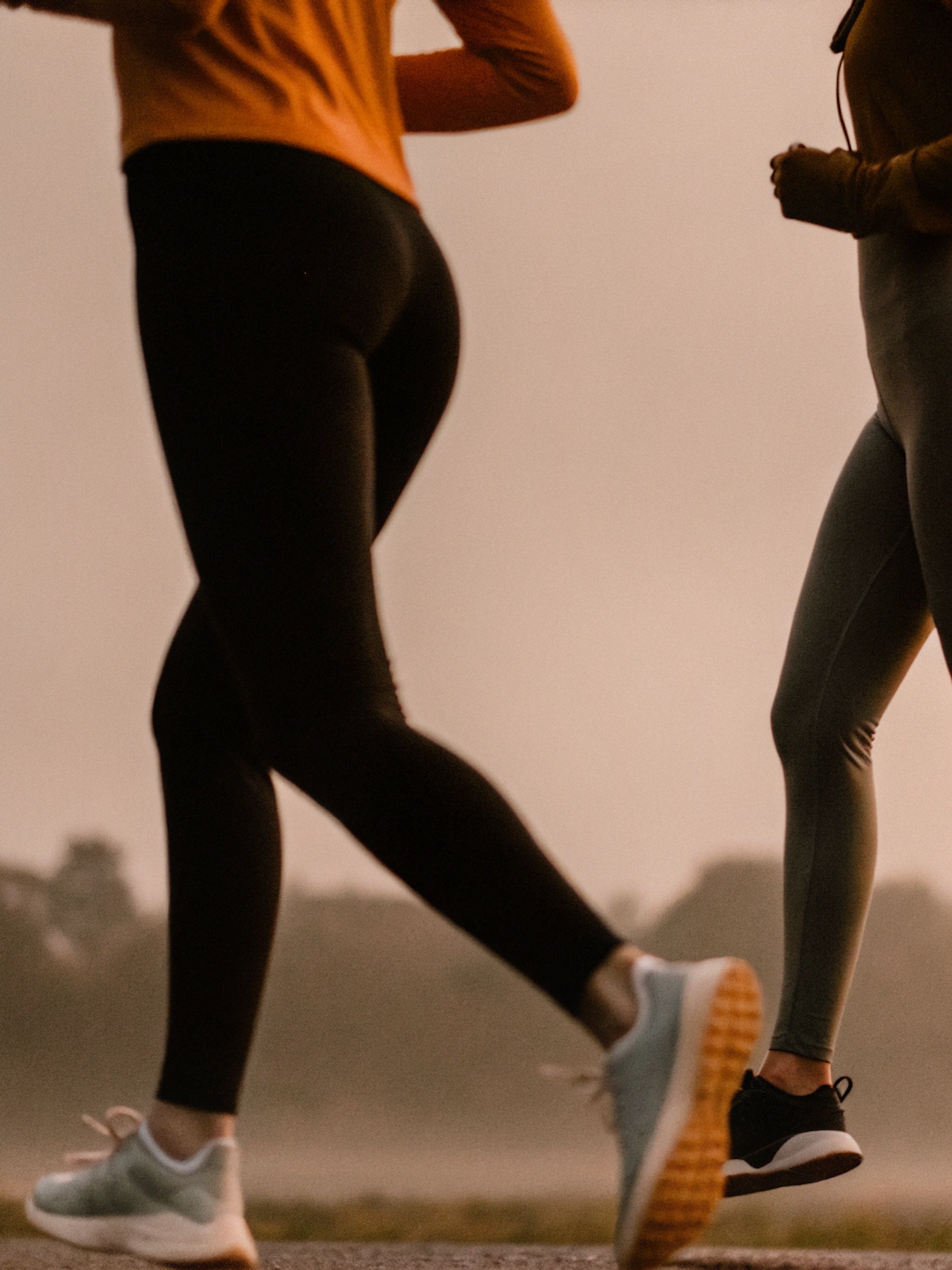 Two people jogging outdoors in leggings and sneakers during golden hour, with a blurred natural background and warm lighting.