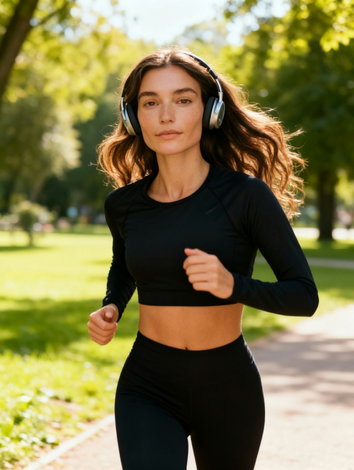 A woman jogging in a park, wearing black athletic wear and headphones, surrounded by greenery and sunlight.