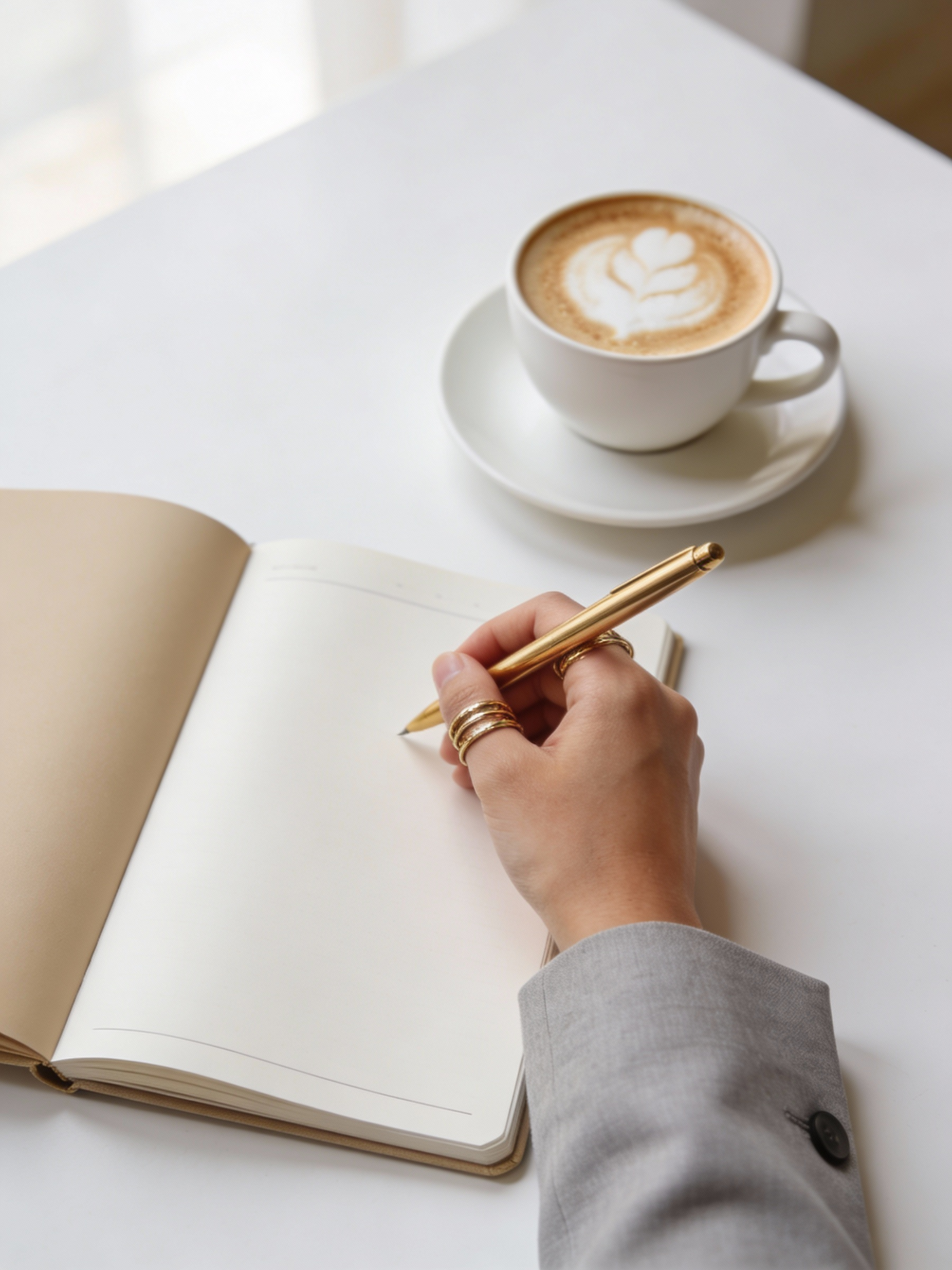 Soft natural daylight, neutral color palette, shallow depth of field, minimal grain, high-resolution lifestyle photo. Overhead view of a white table with a beige planner opened to blank pages and a slim gold pen held by a hand wearing gold rings and a light grey blazer sleeve. On the side, a white ceramic cup of latte with simple foam art rests on a saucer. No laptop in frame. No face visible. Clean modern workspace styling, no clutter, no text, no logos.