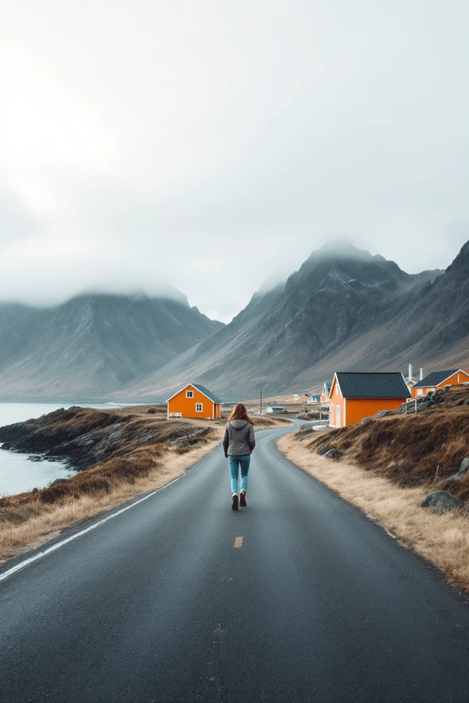 A person walks on a winding road with orange houses, misty mountains, and a coastal view, creating a serene and introspective scene.