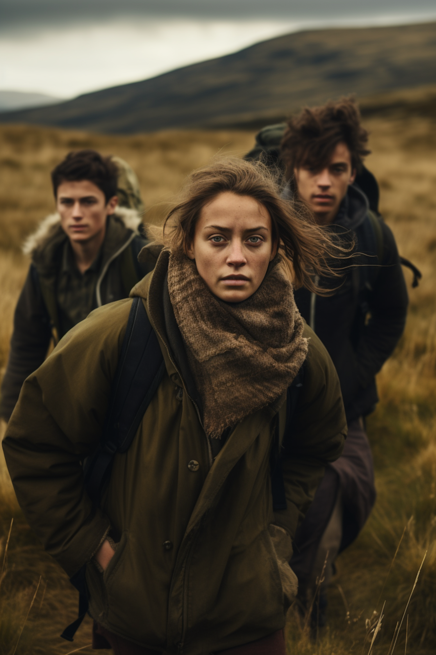 Three young adults trekking through a grassy landscape under a cloudy sky, dressed warmly and carrying backpacks.