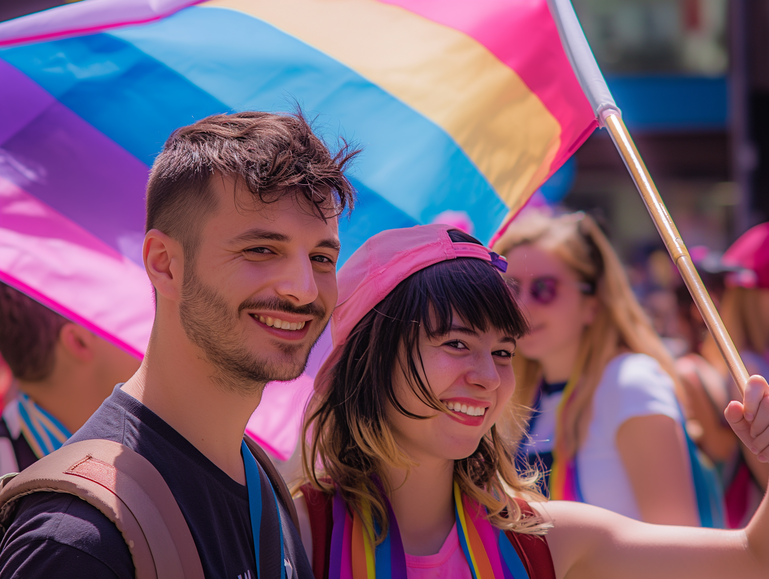 Two smiling young adults at a pride event, holding a vibrant pansexual pride flag, celebrating diversity and inclusion.