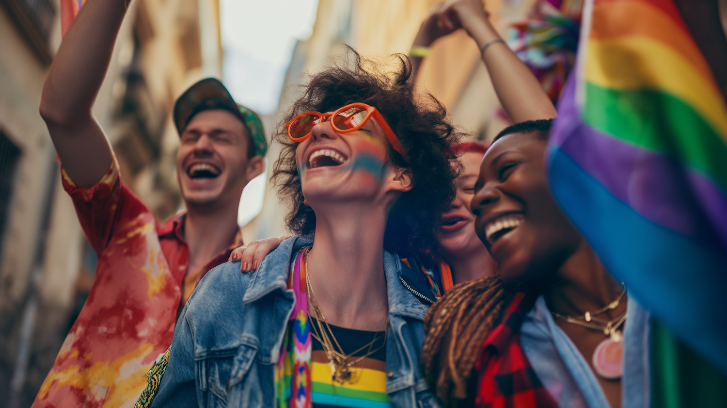 Diverse group celebrating at a pride event with rainbow colors and joyful expressions, featuring vibrant outfits and a rainbow flag.