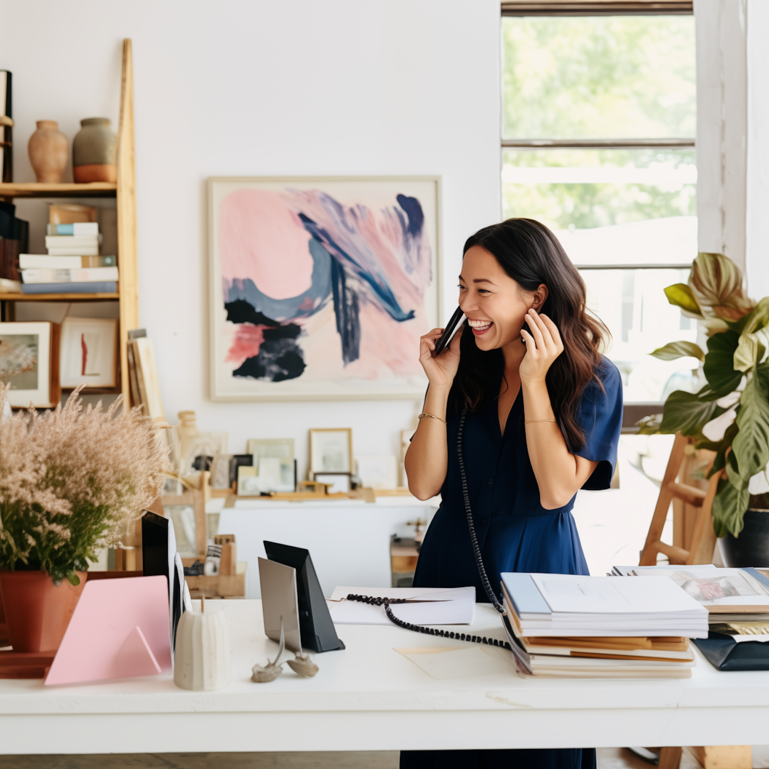 Smiling woman in a navy dress talks on the phone in a bright, artistic office with abstract art and plants.