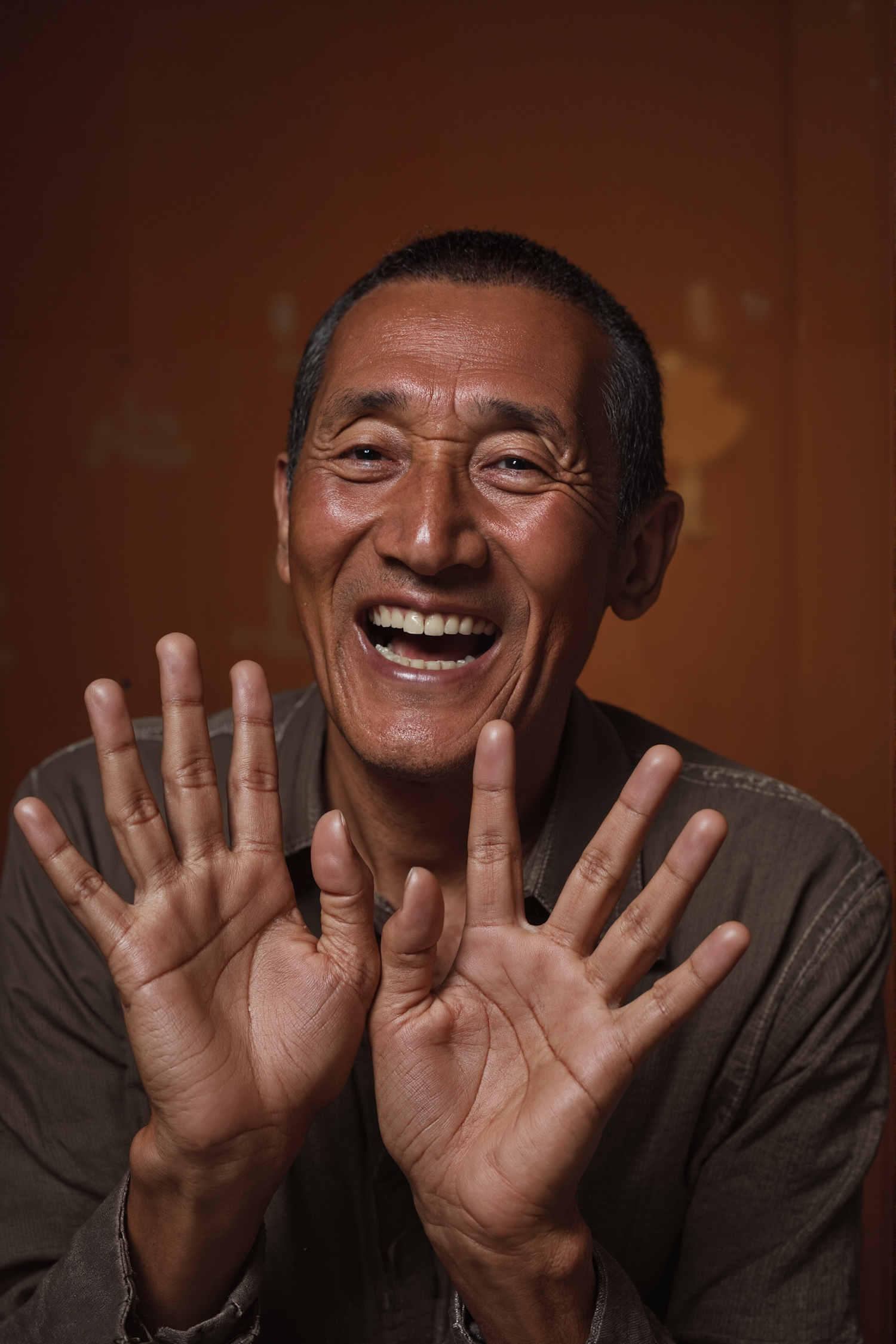 A cheerful middle-aged man with a big smile and open hands, set against a warm orange background. Playful and full of life!