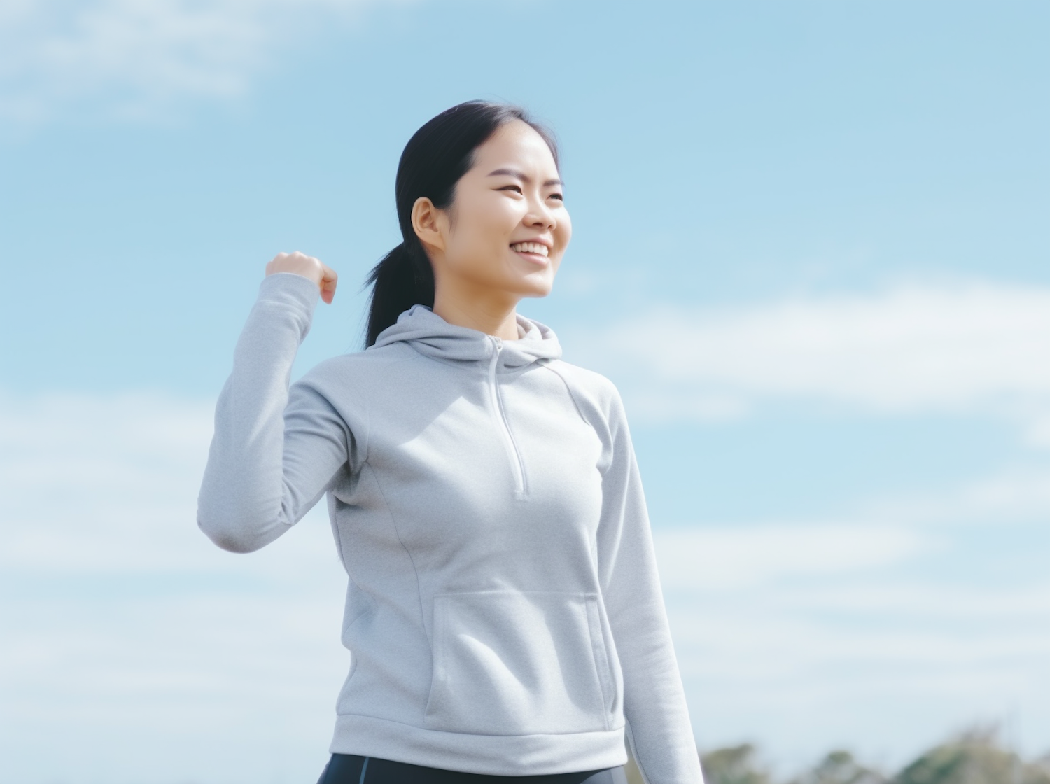 Asian woman in a gray hoodie smiling outdoors with a raised fist, set against a clear blue sky. Bright and cheerful mood.