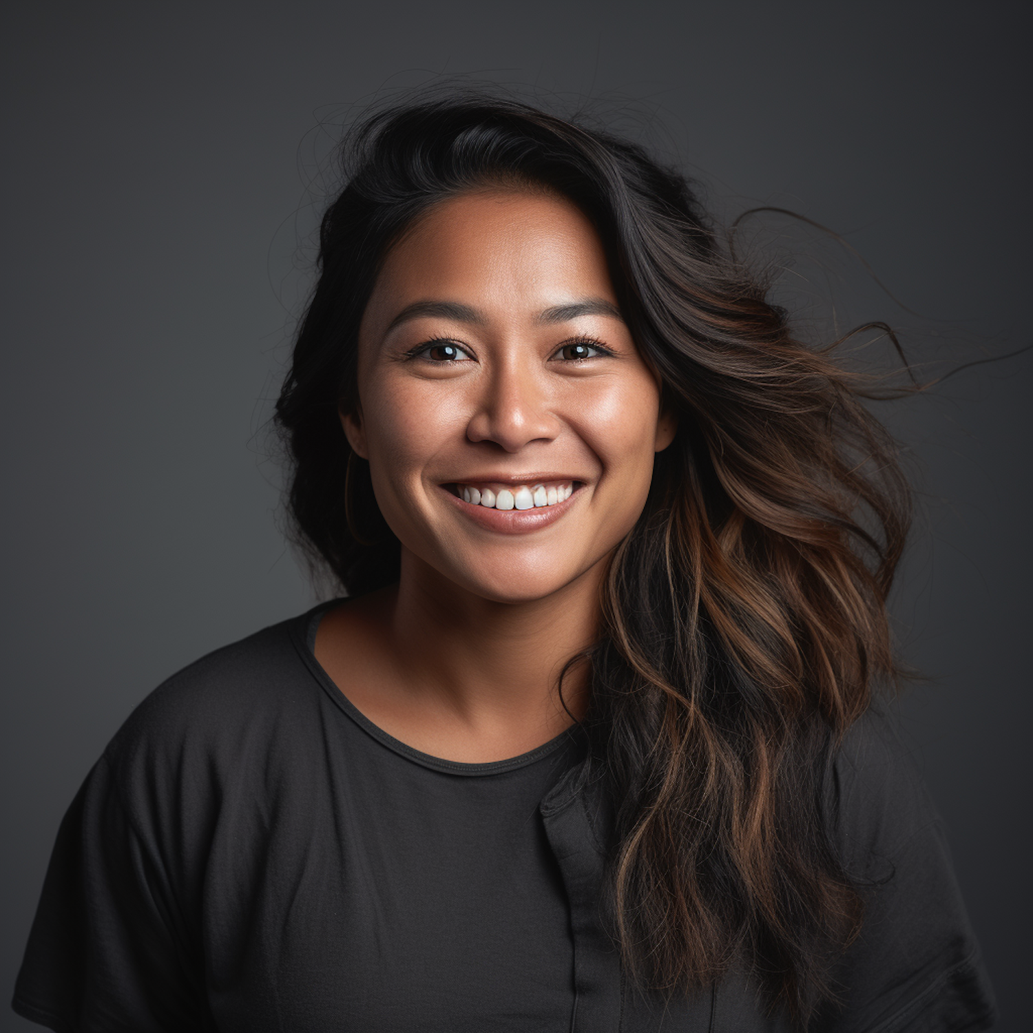 Smiling Asian woman with wavy dark hair and black shirt against a gray background, exuding warmth and positivity.