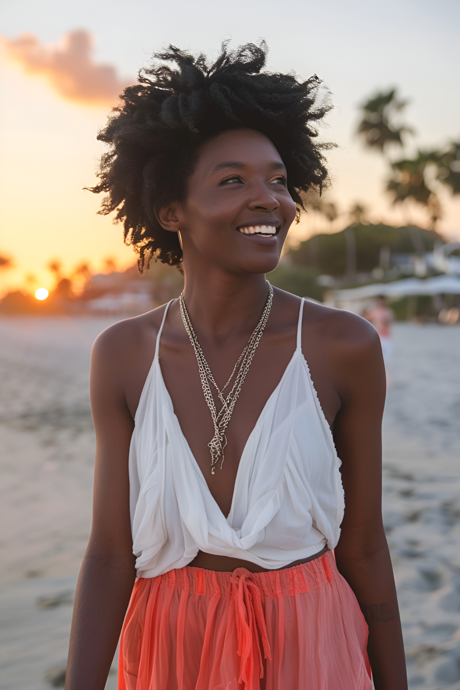 Smiling woman with natural hair in a white top and orange skirt on a beach at sunset, wearing layered necklaces.