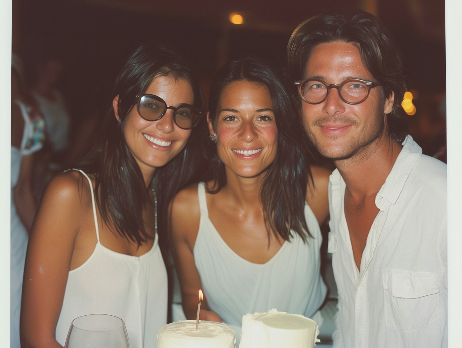 Three friends celebrate with a cake, smiling warmly in white attire, suggesting a festive occasion.