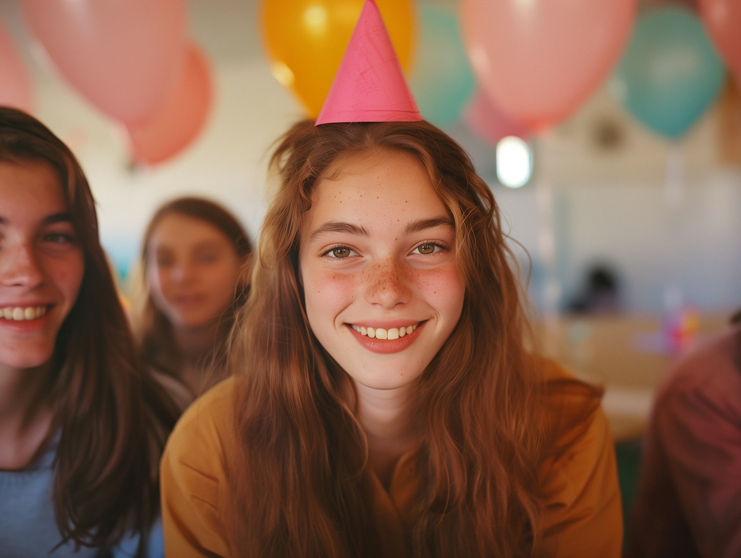 Smiling girl with a pink party hat at a festive gathering, surrounded by colorful balloons and friends.