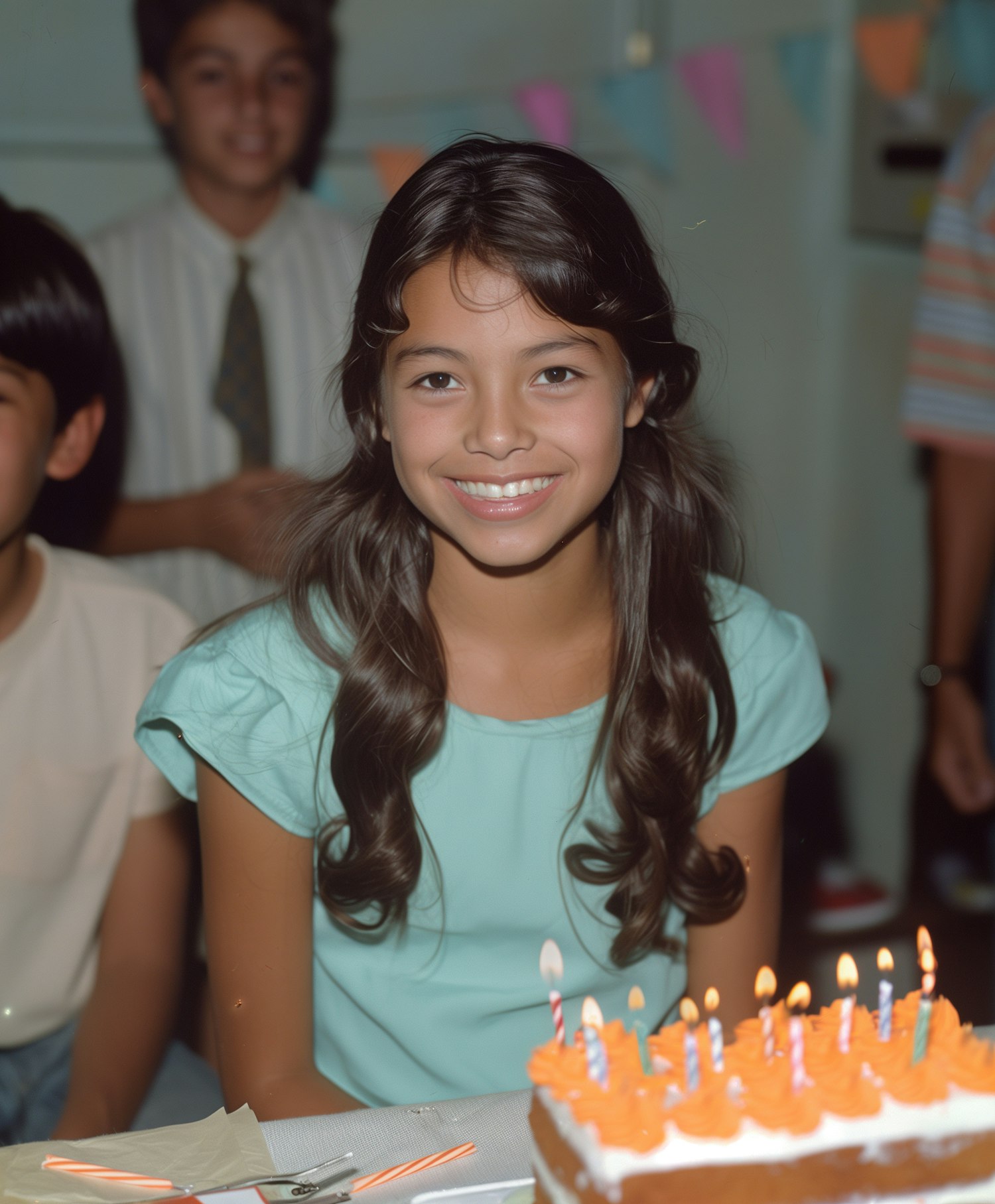 Smiling girl at a birthday party with a cake and lit candles, surrounded by friends and festive decorations.