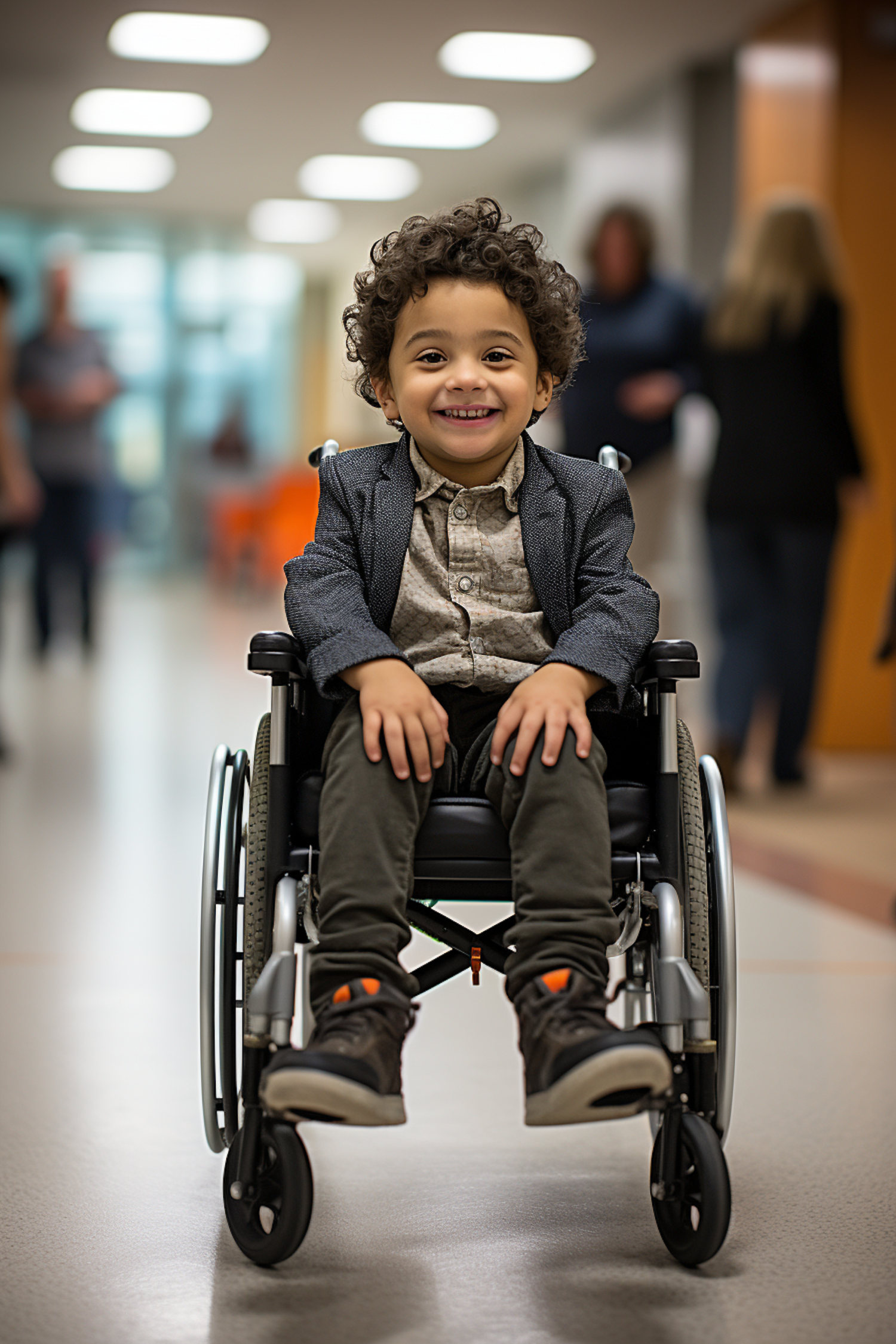 Smiling child with curly hair in a wheelchair, wearing a blazer and sneakers, in a bright hallway setting.