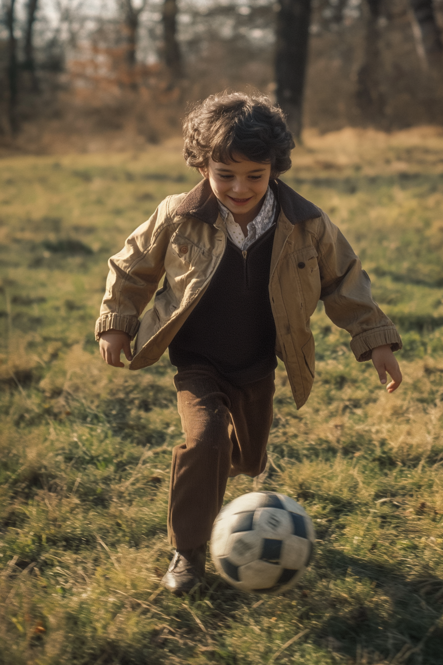 Young boy with curly hair playing soccer in a sunny field, wearing a brown jacket and pants, focused on a black and white soccer ball.