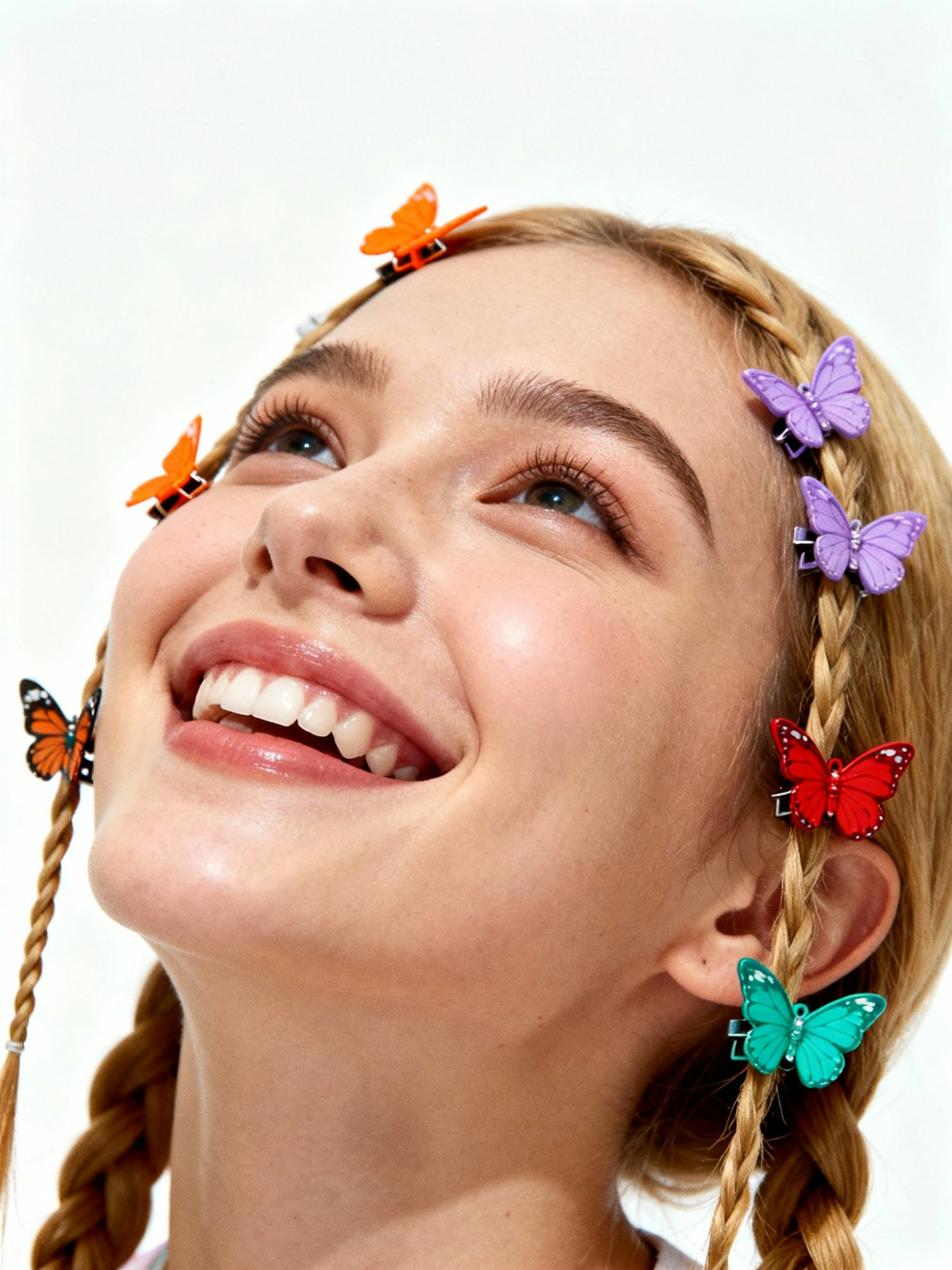 Studio portrait, plain white seamless background, soft even lighting, clean editorial aesthetic, no shadows, high detail, realistic photography, sharp focus on face and hair accessories Close-up of a young woman with warm beige skin, honey blonde hair styled into two thin braids framing her face. She tilts her head upward with a joyful smile. Each braid is decorated with colorful butterfly hair clips in orange, lilac, teal, and red, attached asymmetrically for a playful Y2K vibe.