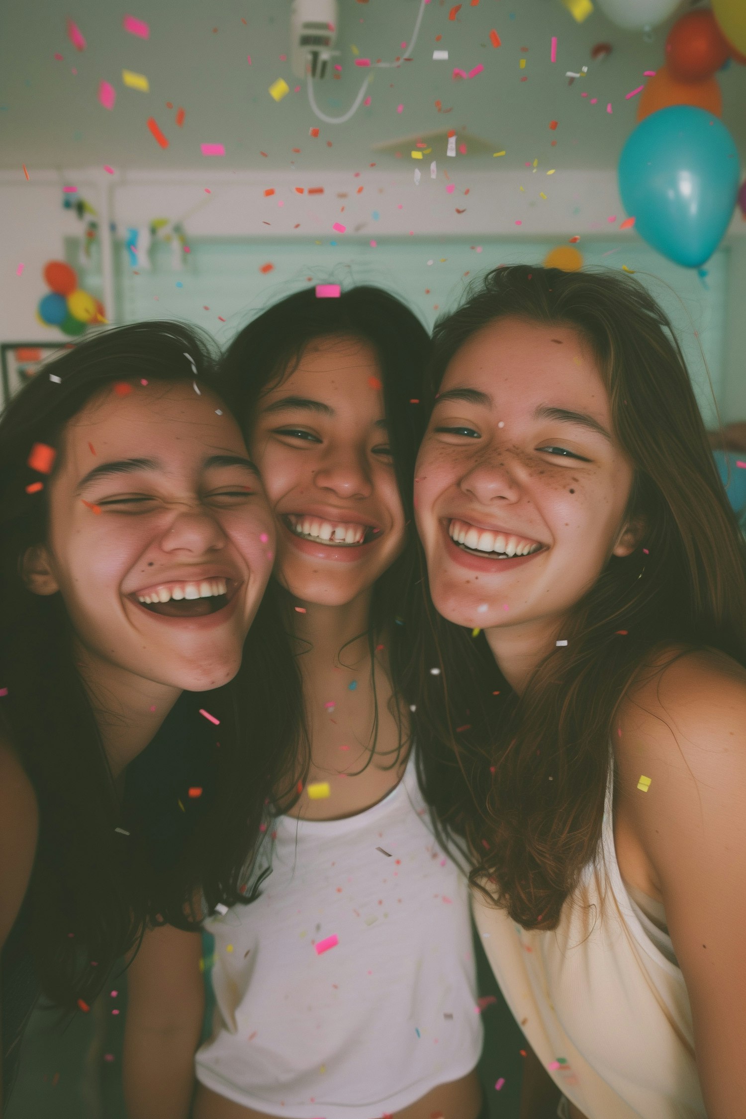 Three young women laughing together amidst falling confetti, with colorful balloons in the background, creating a festive atmosphere.