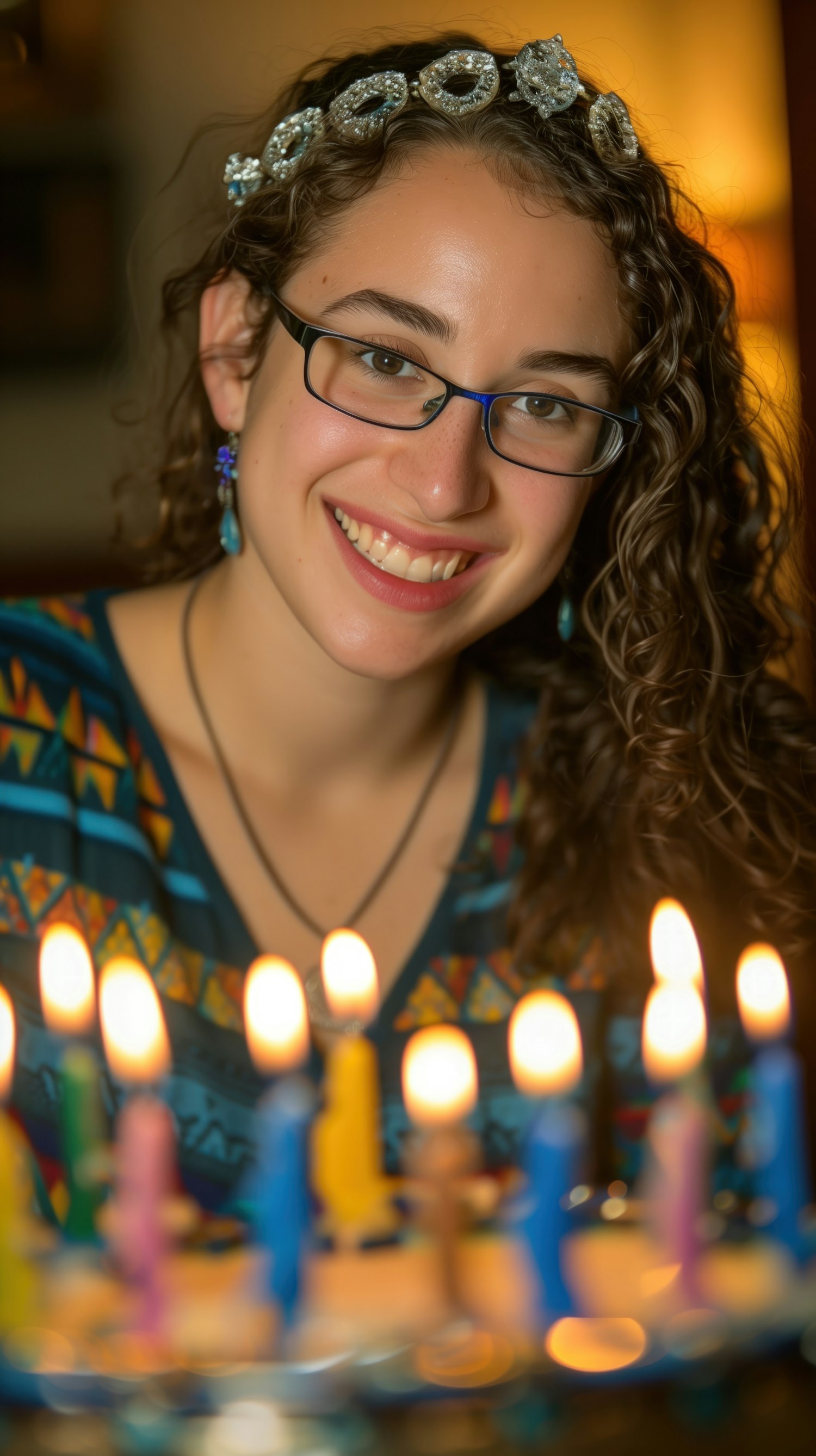 Smiling woman with glasses and curly hair, wearing a headband, in front of a lit menorah. Warm, festive atmosphere.