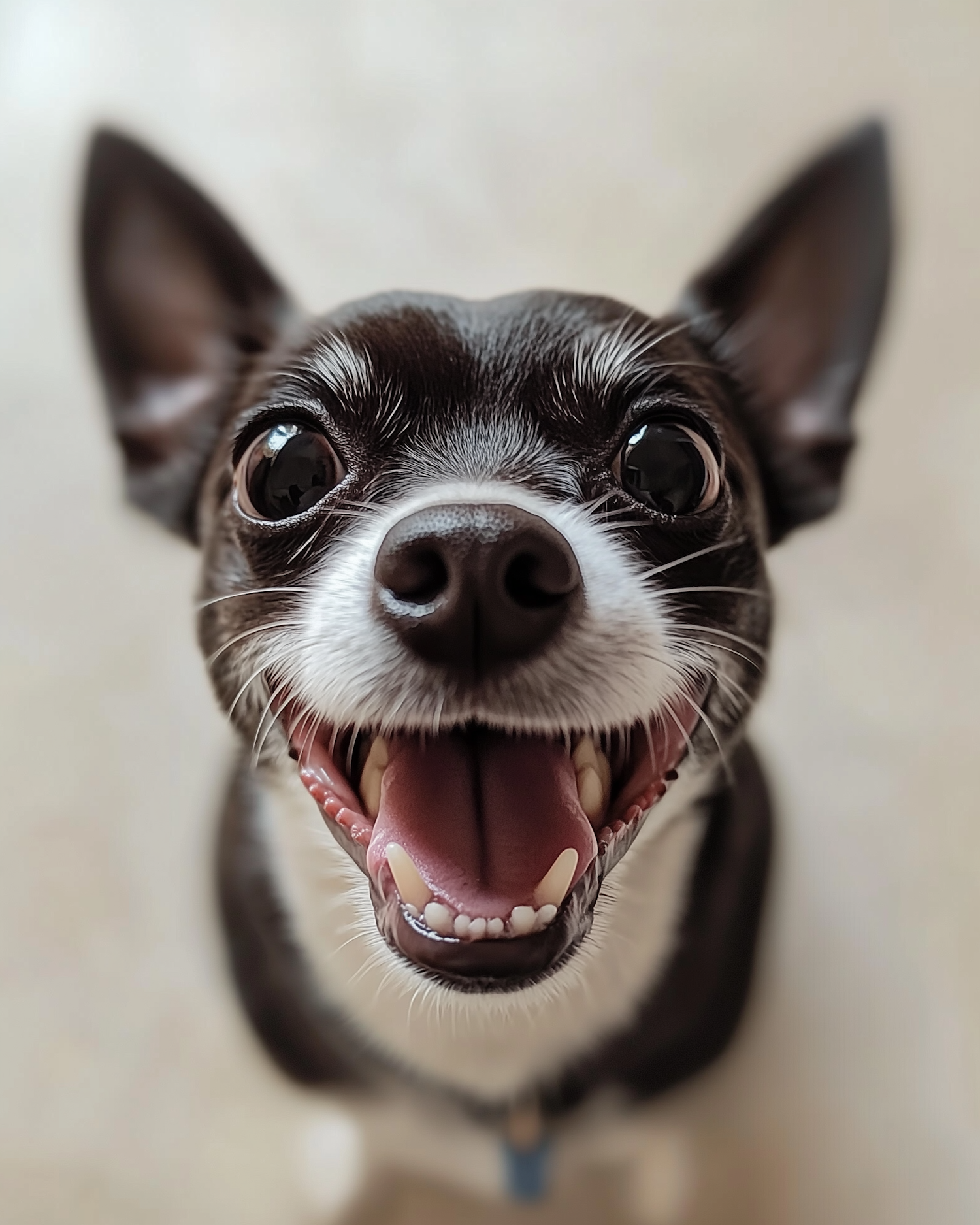 Close-up of a joyful Chihuahua with big eyes and a wide smile, showcasing its playful and cheerful expression.