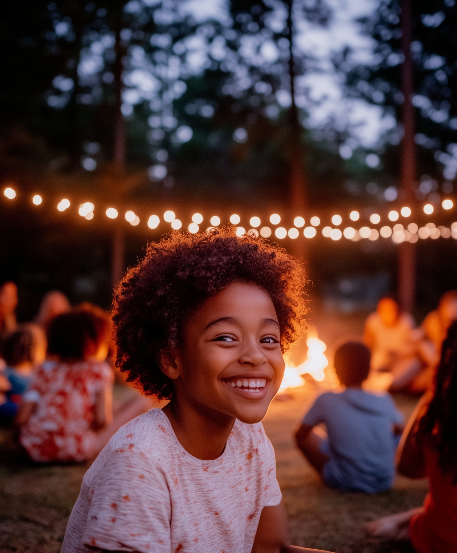 Joyful girl with curly hair at a campfire gathering, surrounded by string lights and friends in a warm, outdoor setting.