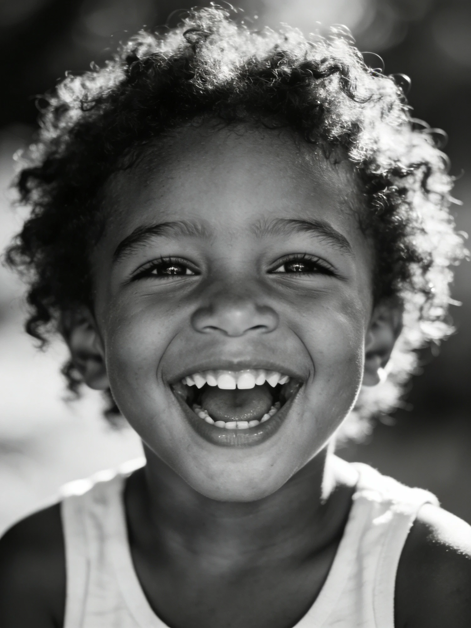 A young Black child with curly hair beams with a wide, joyful smile—eyes expressive, teeth showing, radiating pure delight. The child wears a sleeveless top and appears mid-laughter, captured in a spontaneous moment of excitement. The photograph is rendered in black and white, emphasizing tonal contrast and emotional clarity. The background is softly blurred, drawing full attention to the child’s face and the vibrant energy of the expression. Lighting is gentle and luminous, highlighting skin texture, curl definition, and the contours of the smile. The mood is exuberant and cinematic, blending innocence, vitality, and emotional resonance in a timeless portrait. Hyperrealistic rendering should focus on facial expression, skin detail, and grayscale harmony across light and shadow.