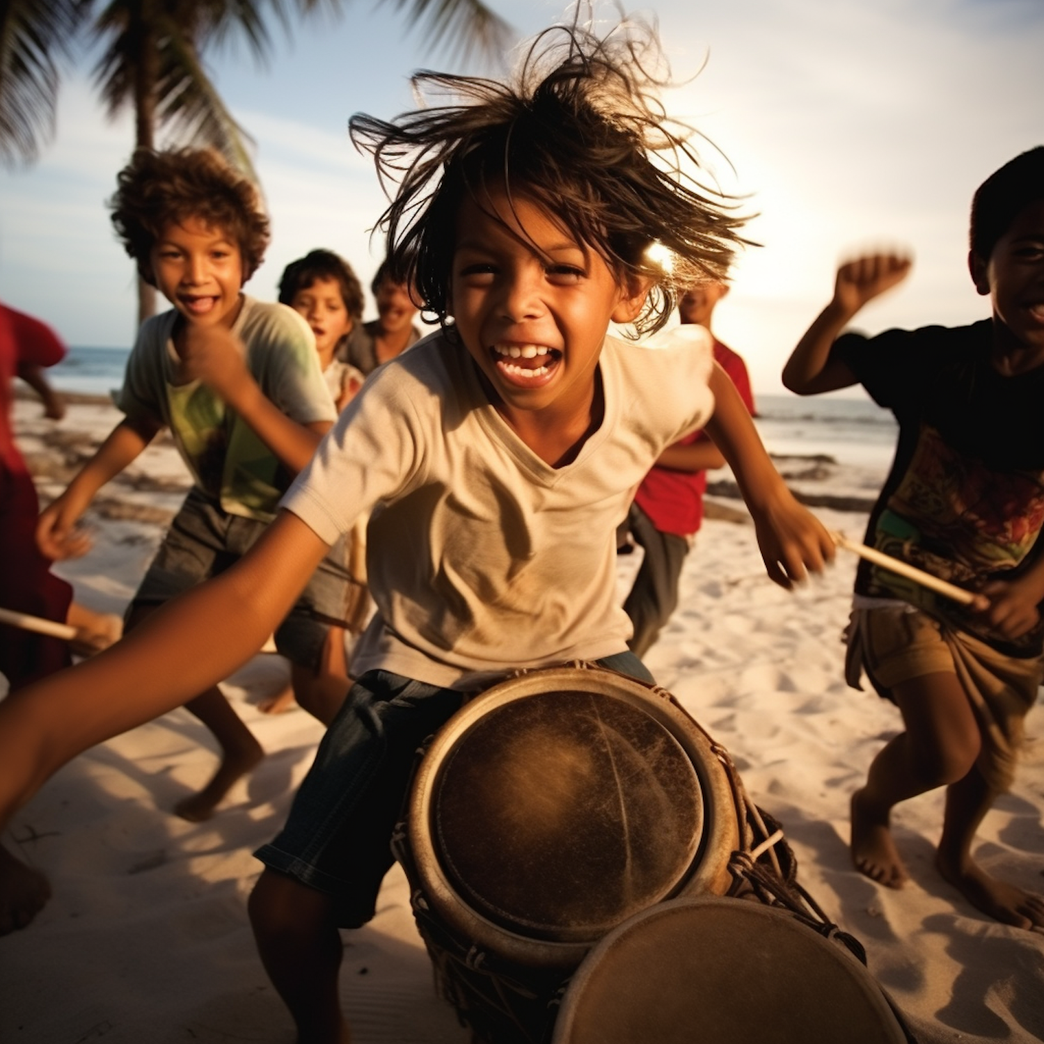 Joyful children playing drums on a sunny beach, surrounded by palm trees and ocean waves, capturing a lively and carefree moment.