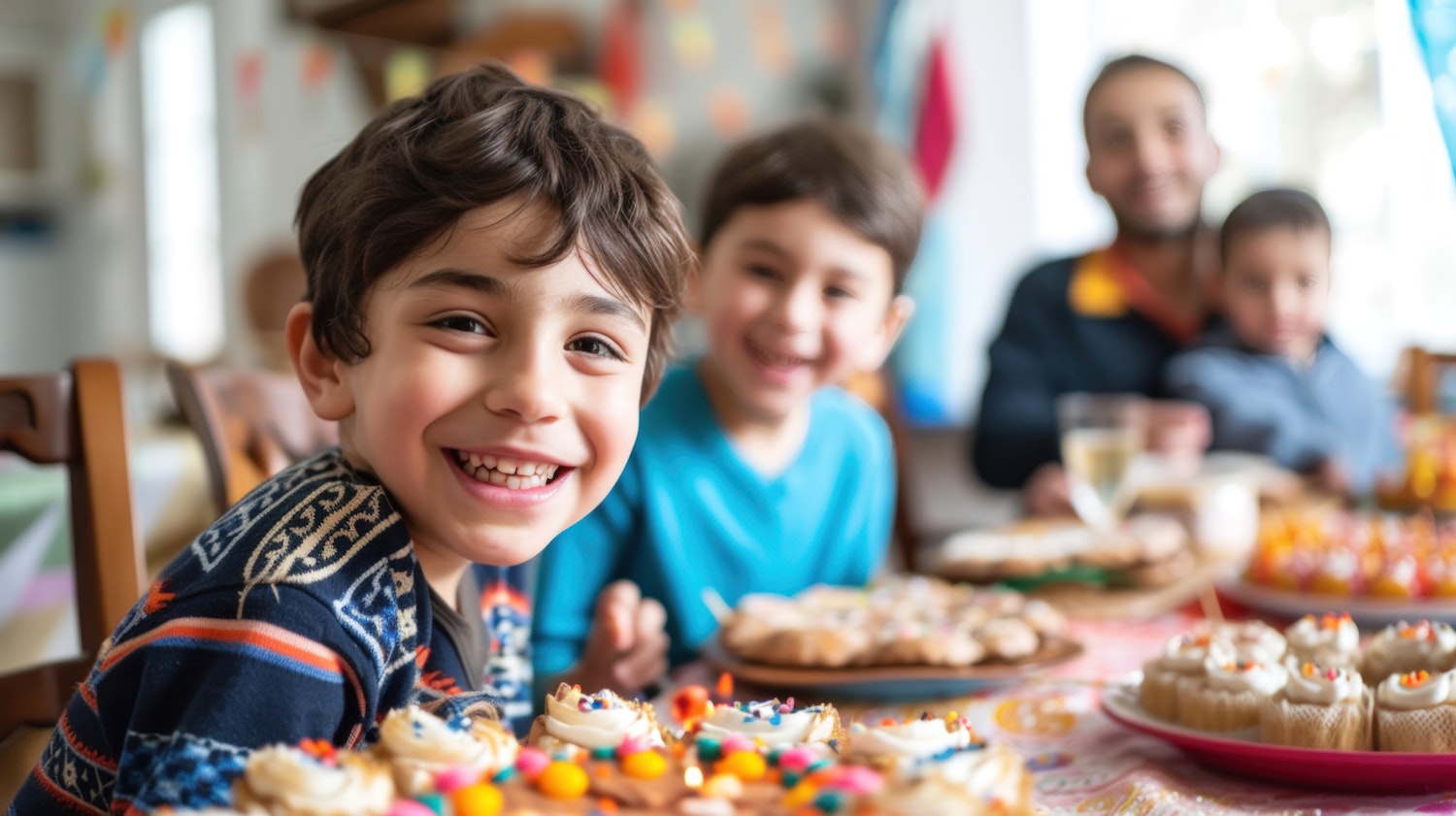 Joyful children at a festive table with colorful cupcakes, celebrating with family in a warm, cheerful setting.