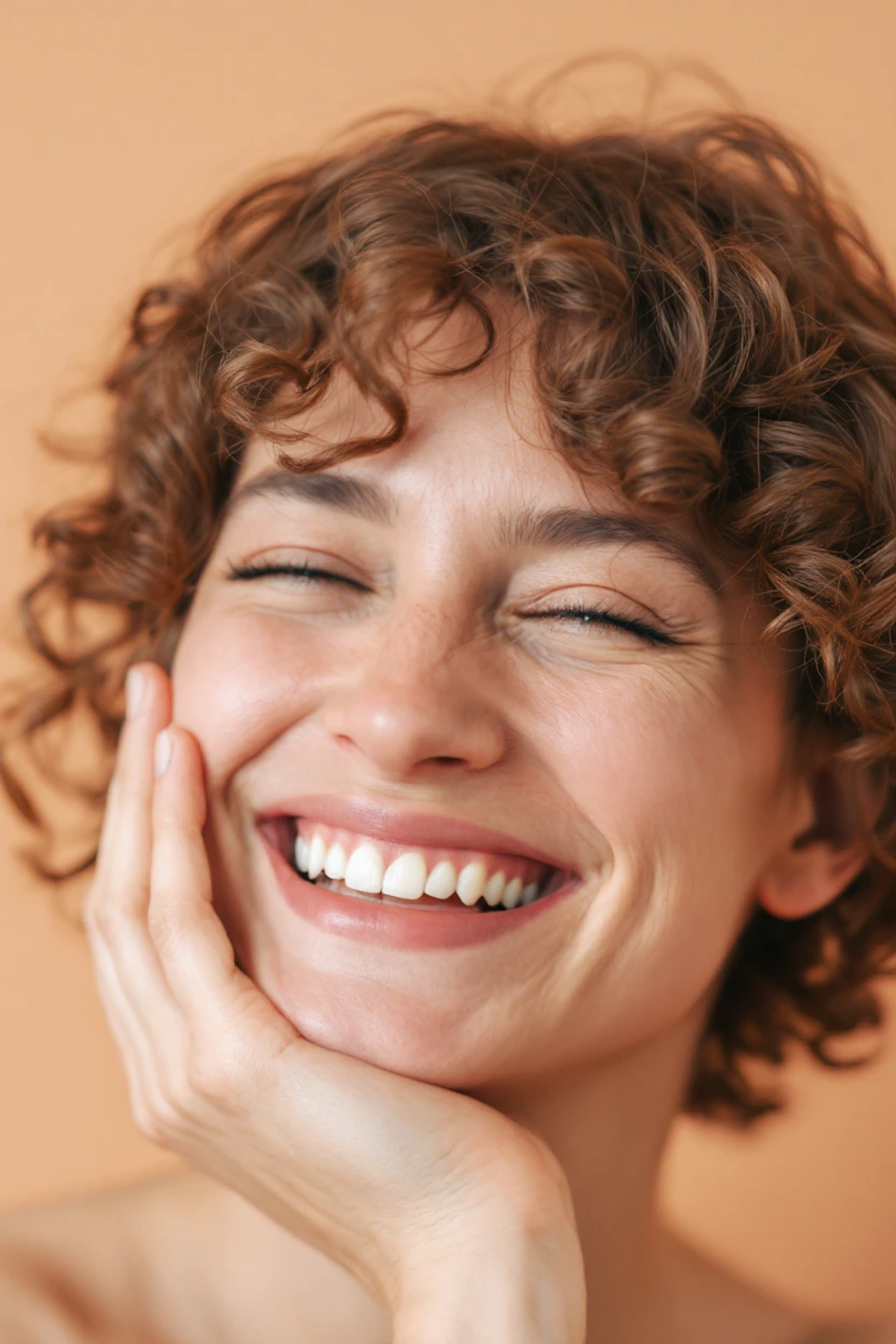 Close-up of a smiling woman with curly brown hair and fair skin against a peach background, exuding warmth and joy.