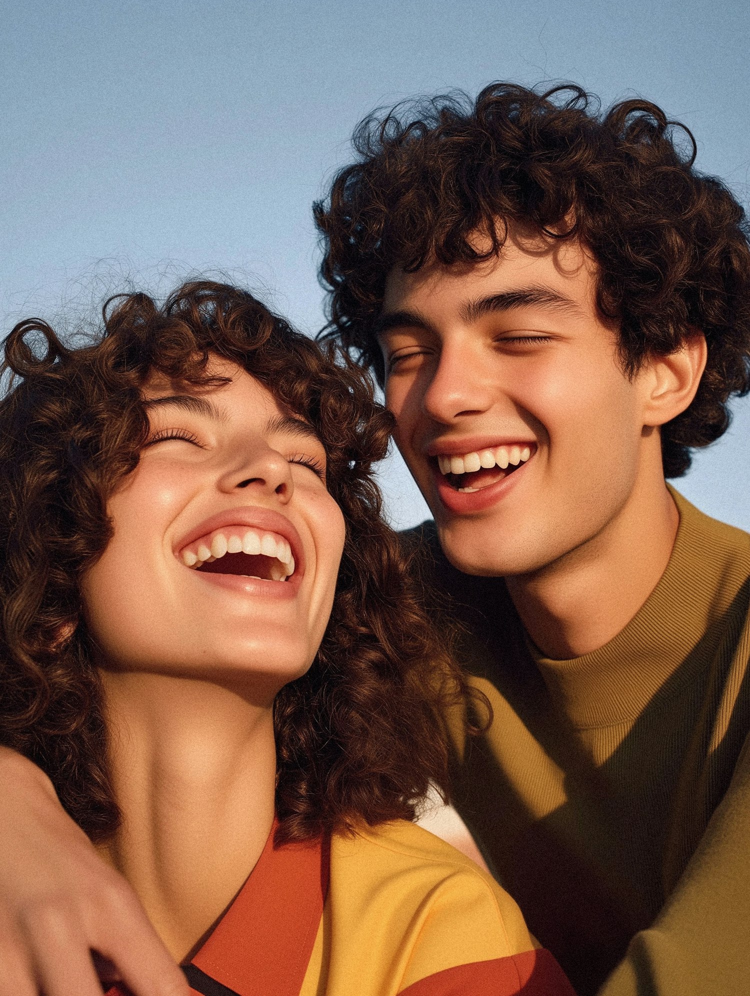 Two young adults with curly hair share a joyful laugh under a clear blue sky, exuding happiness and warmth.