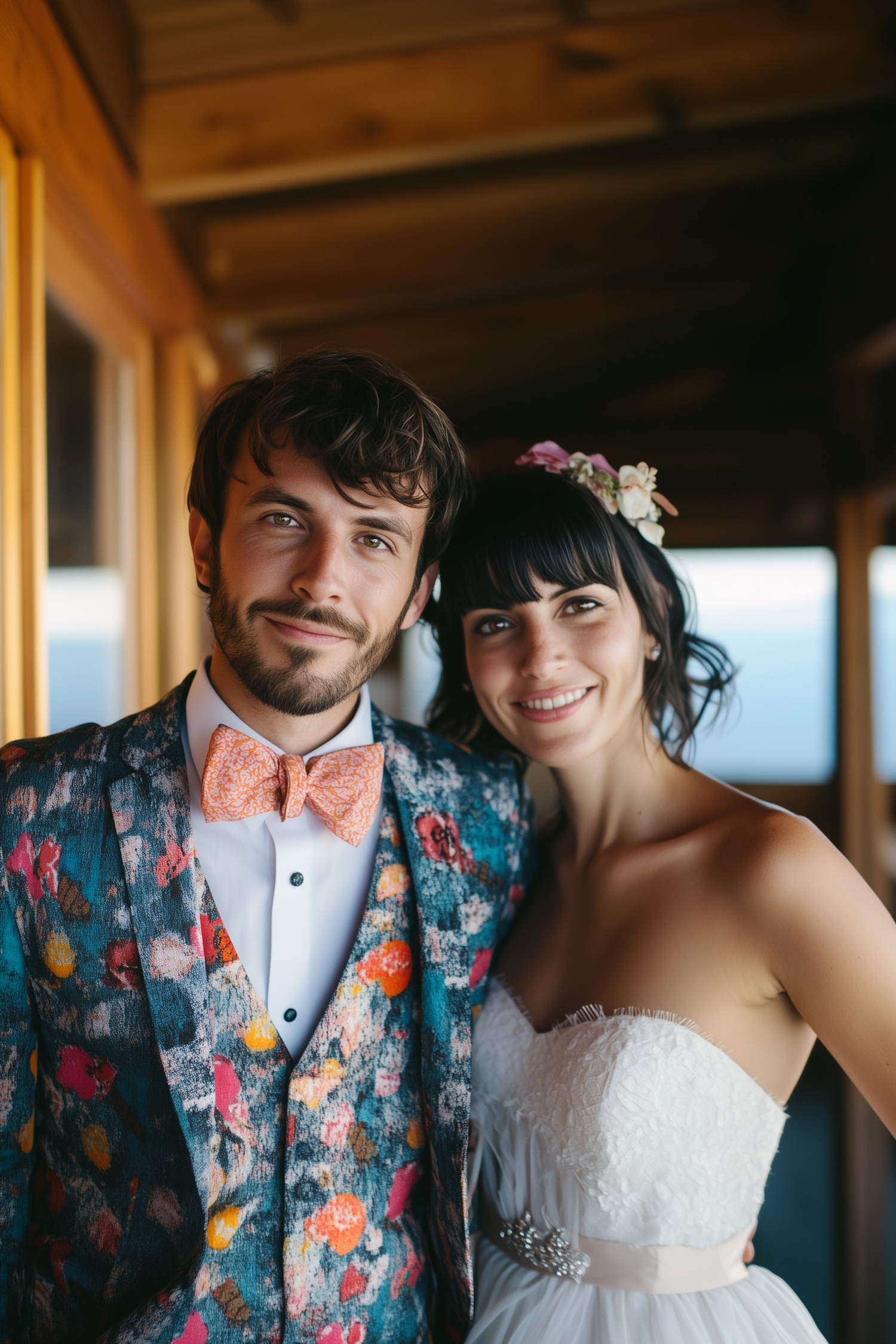 A joyful couple in vibrant attire, with a floral suit and elegant wedding dress, share a warm smile in a rustic setting.