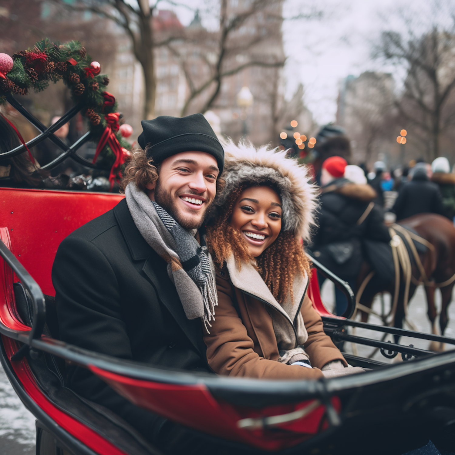 Smiling couple enjoys a festive winter carriage ride in a city park, surrounded by holiday decorations and a lively atmosphere.