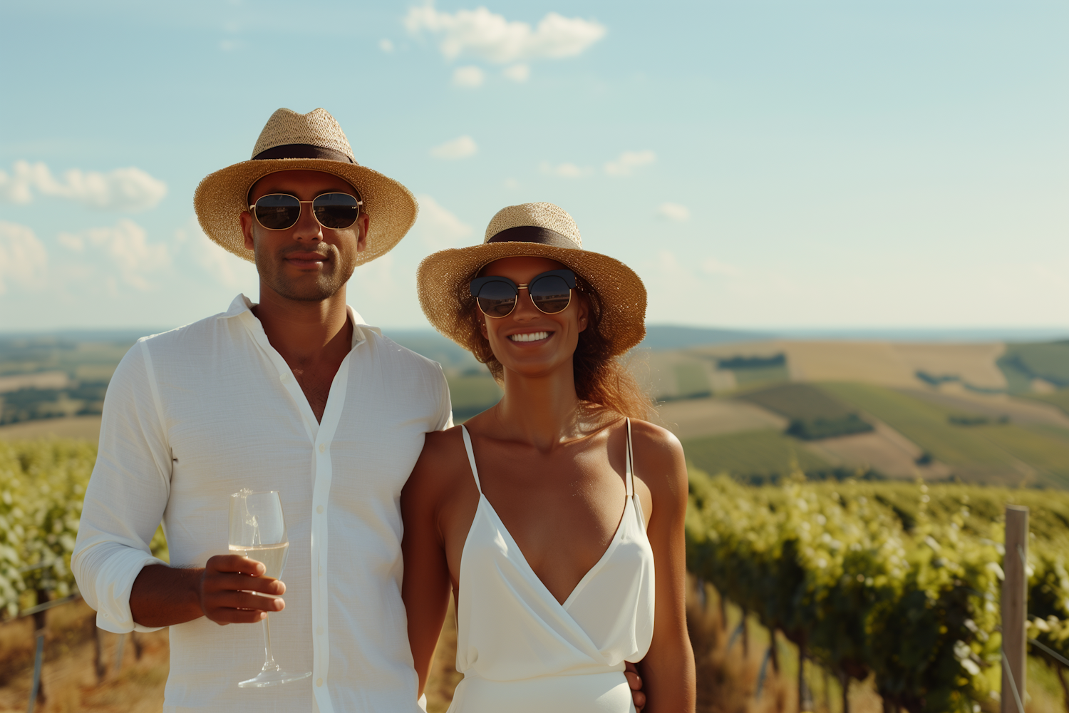 Couple in a vineyard wearing straw hats and sunglasses, enjoying a sunny day with wine. Scenic rolling hills in the background.