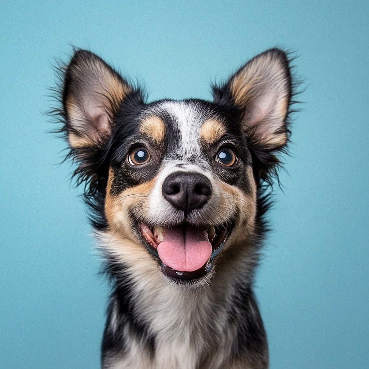 Adorable small dog with black, white, and tan fur, smiling against a light blue background. Bright eyes and upright ears add charm.