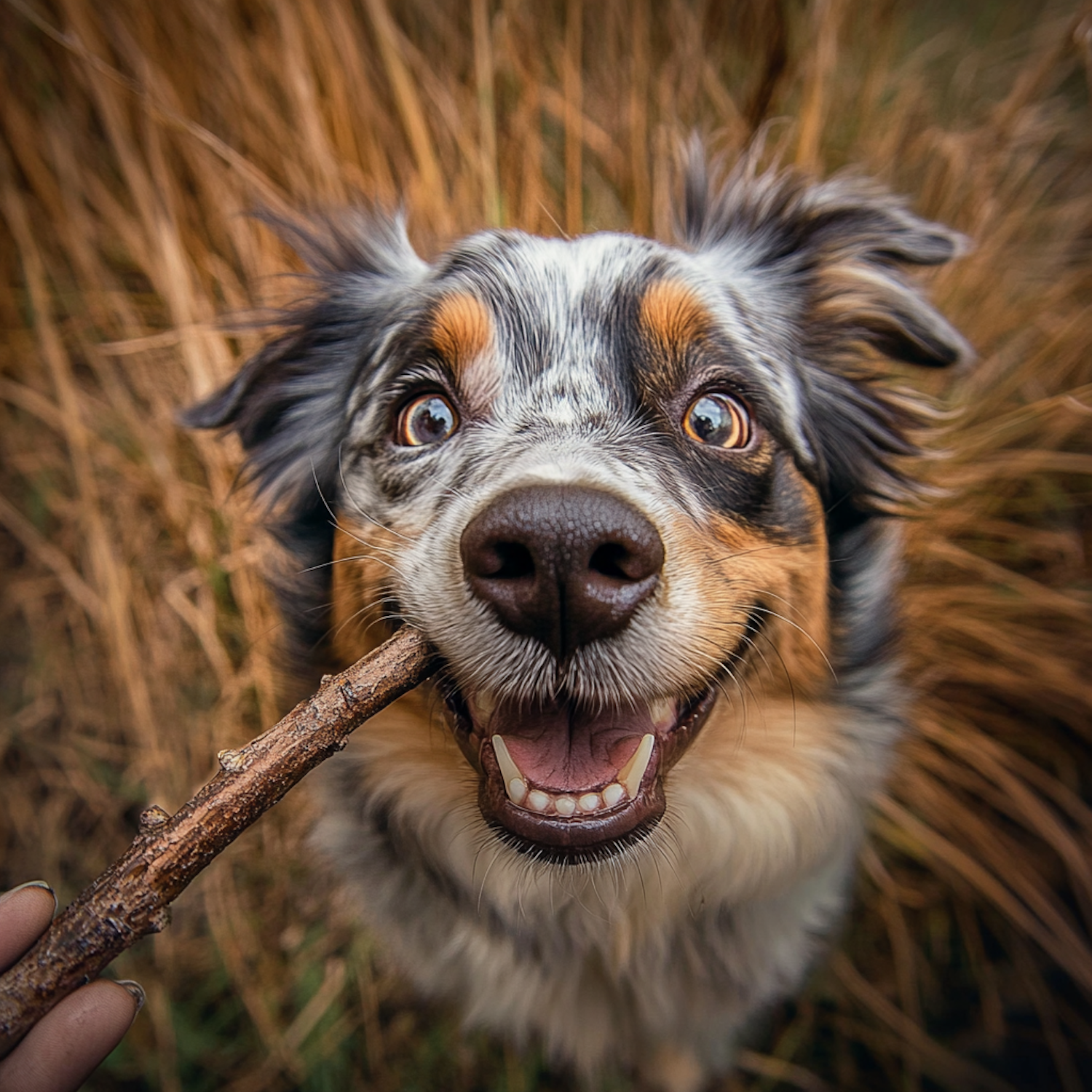 Joyful dog with multicolored fur playfully holds a stick in its mouth, surrounded by tall dry grass, exuding excitement and happiness.