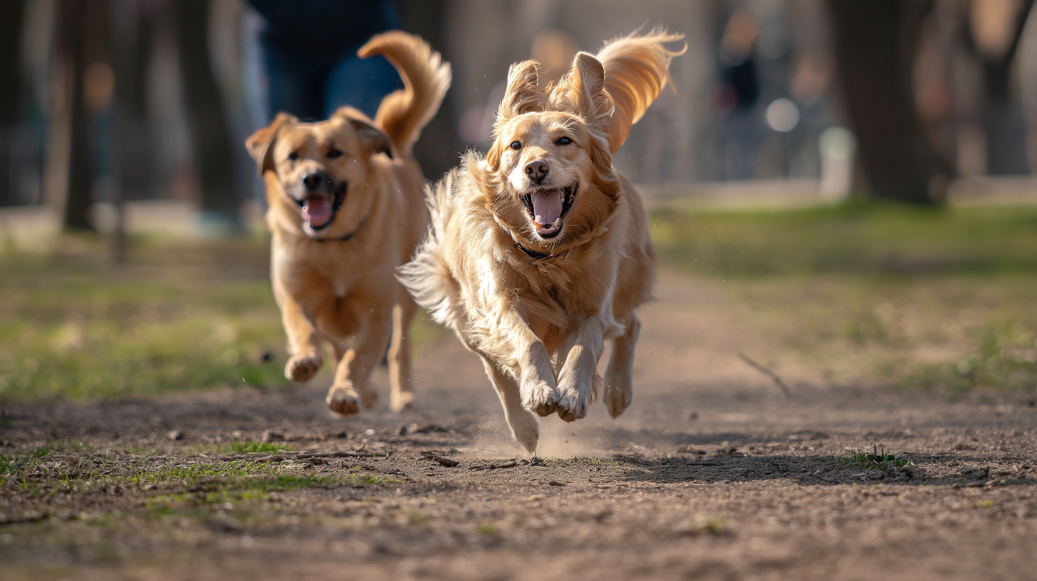 Two golden retrievers joyfully running on a dirt path, ears flapping, in a sunlit park setting.