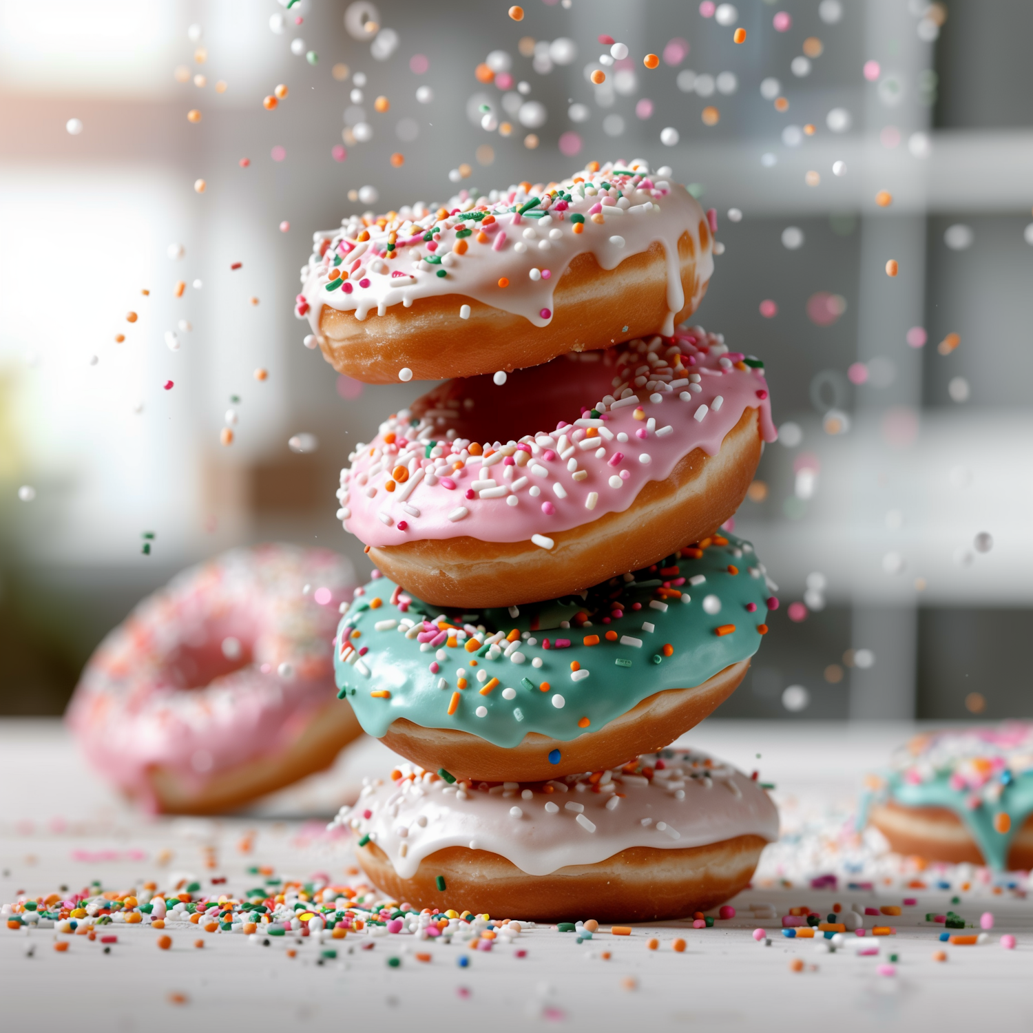Vibrant stack of donuts with colorful icing and sprinkles, creating a playful and indulgent scene.
