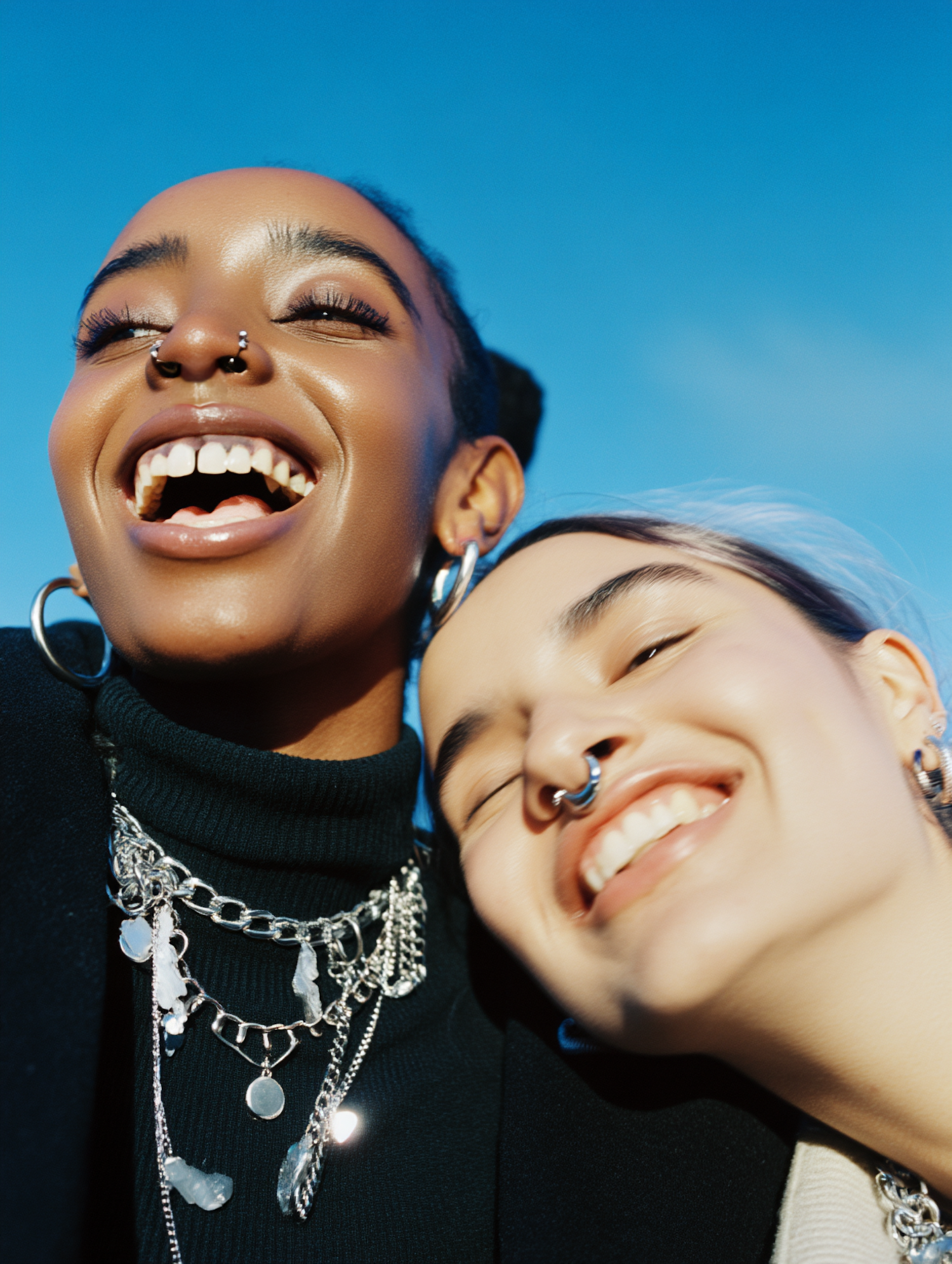 Two friends share a joyful moment under a bright blue sky, showcasing radiant smiles, stylish jewelry, and a carefree vibe.