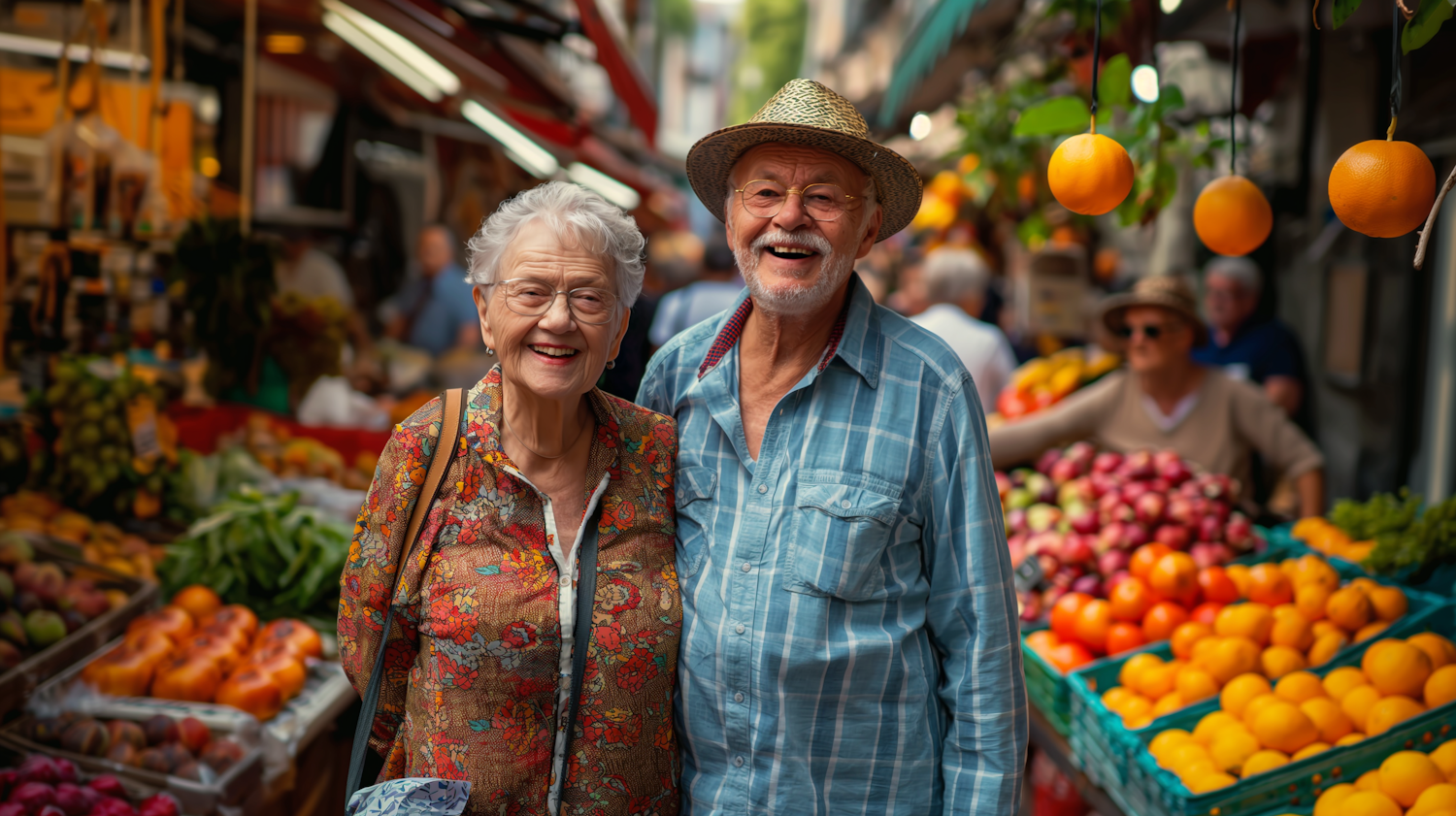 Elderly couple smiling in a vibrant market with colorful fruits and bustling atmosphere.