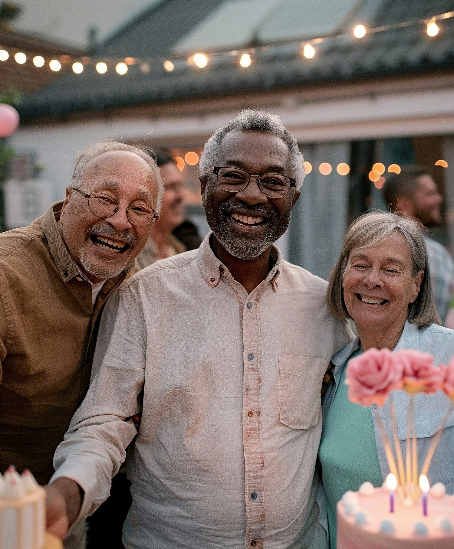 Three elderly friends celebrate with a birthday cake, smiling under festive string lights. Joyful and heartwarming scene.