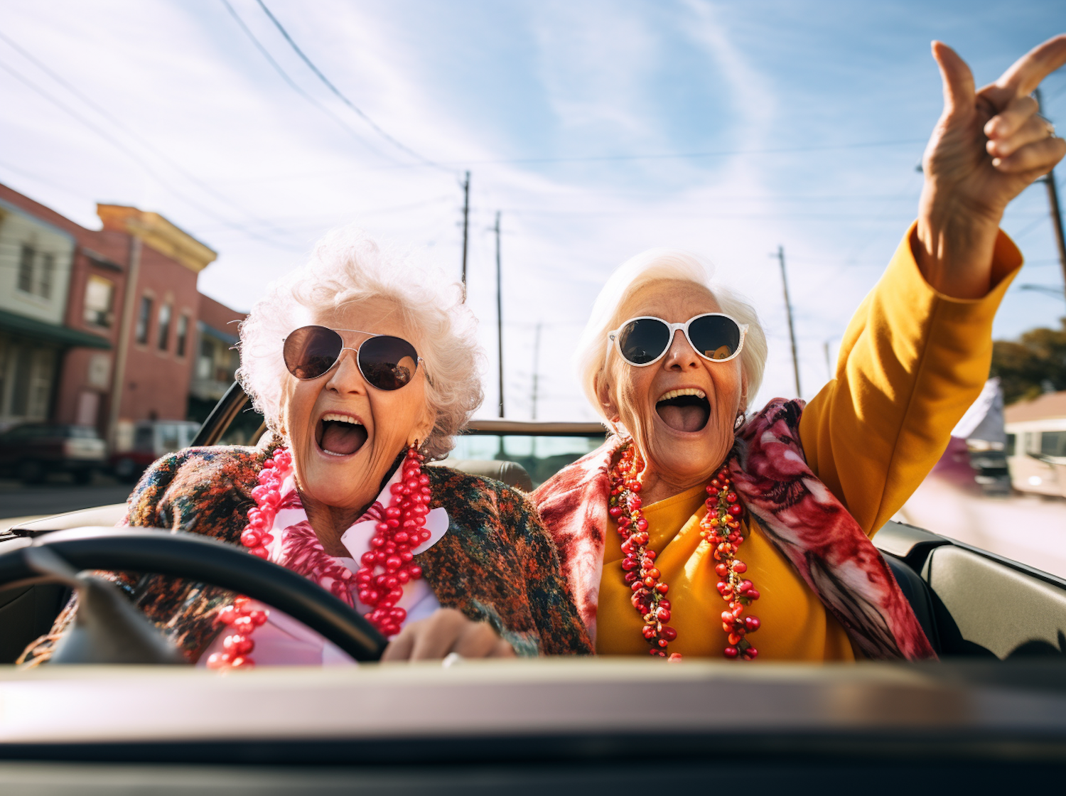 Two elderly women joyfully ride in a convertible, wearing sunglasses and colorful outfits, exuding fun and adventure on a sunny day.